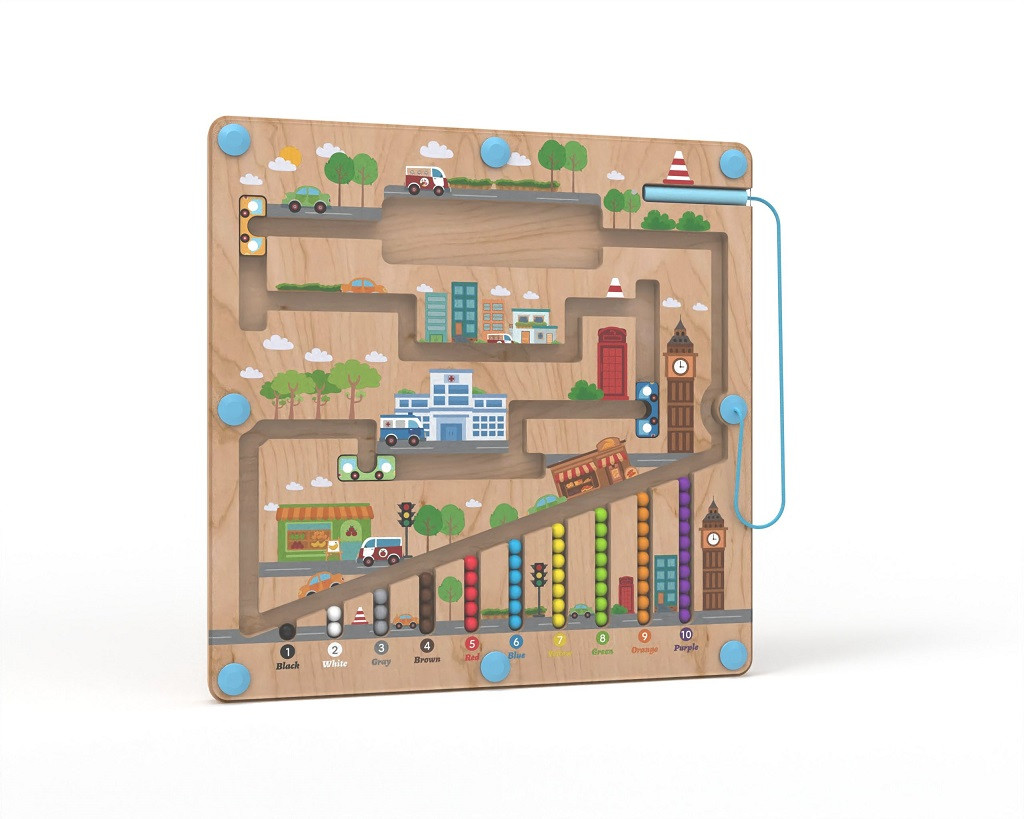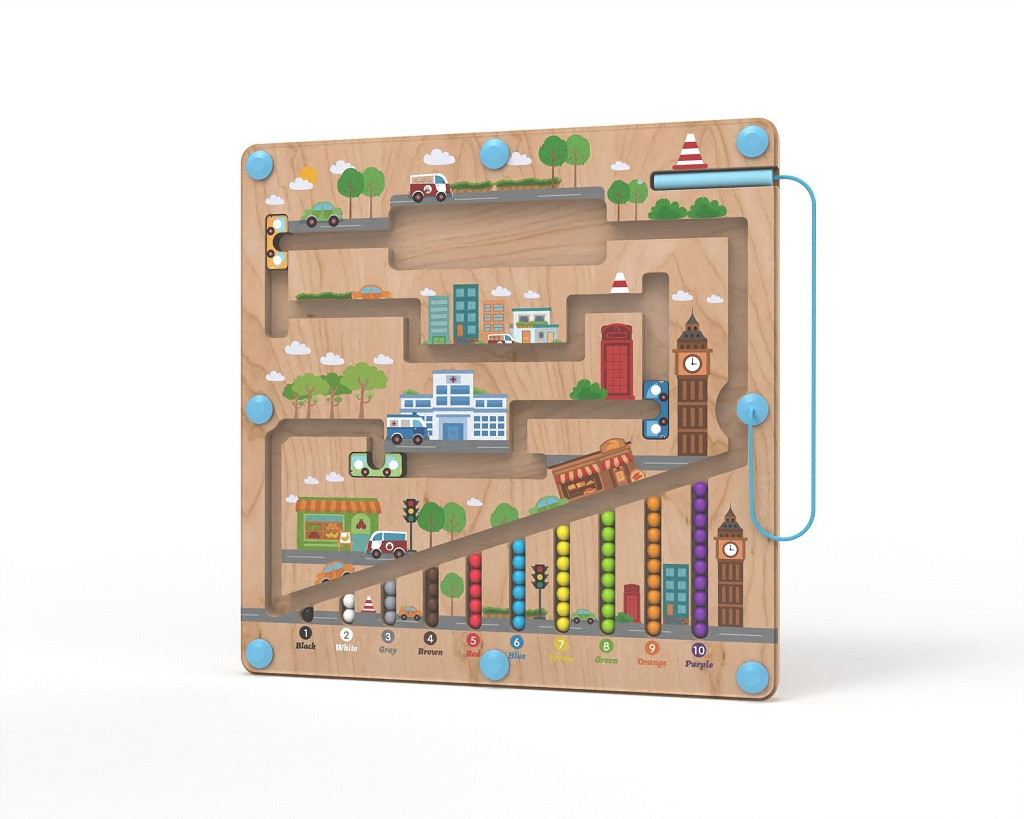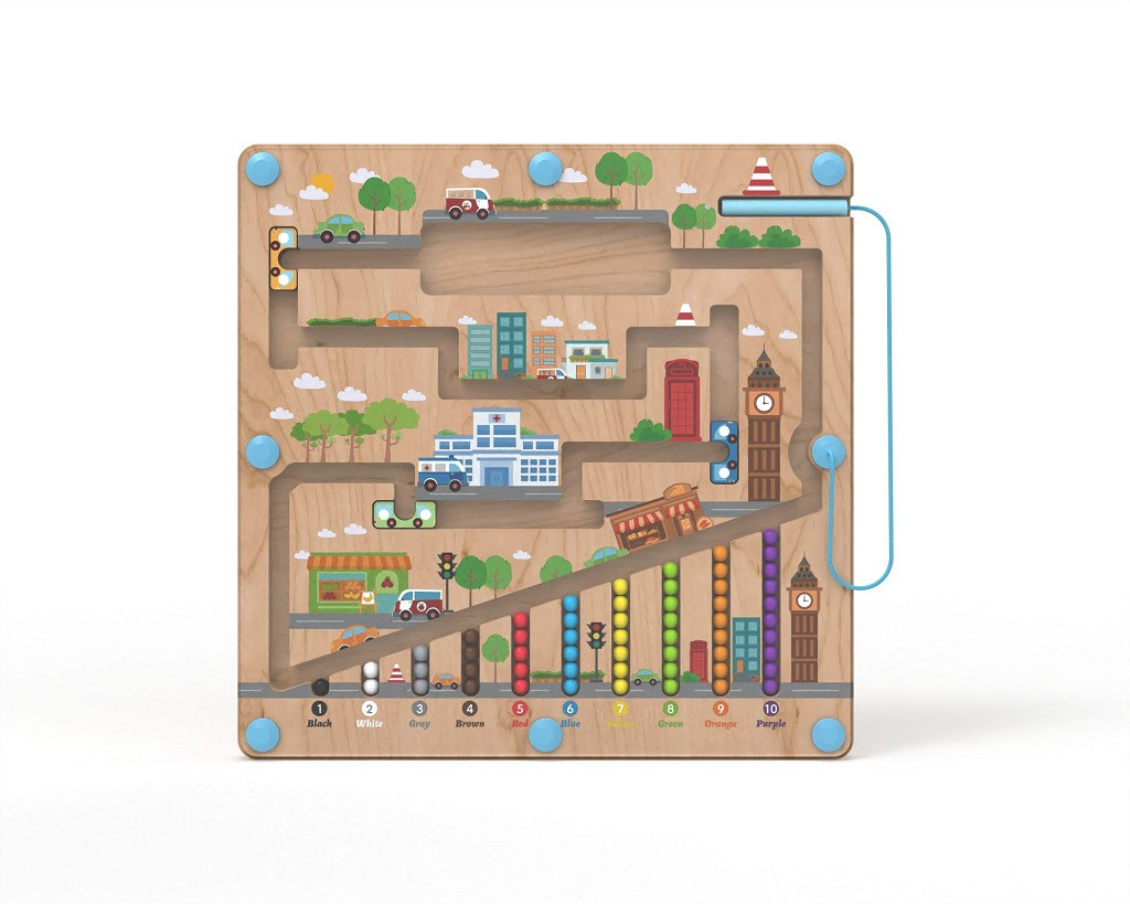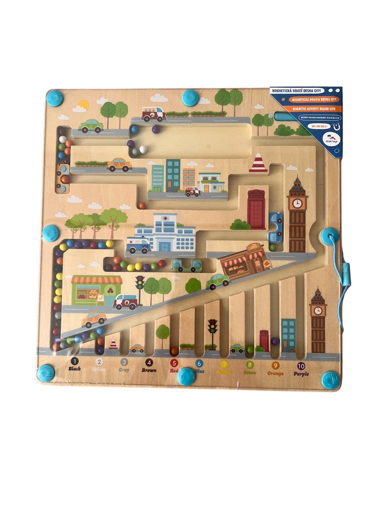 Városi témájú mágneses útvonaljáték, ahol a gyerekek színes golyókat irányítanak buszokkal és utacskákon át. Kiválóan fejleszti a türelmet, a térbeli tájékozódást, a szókincset és az első számolási készségeket. A fa alaplapot átlátszó műanyag védi, így biztonságos és tartós.