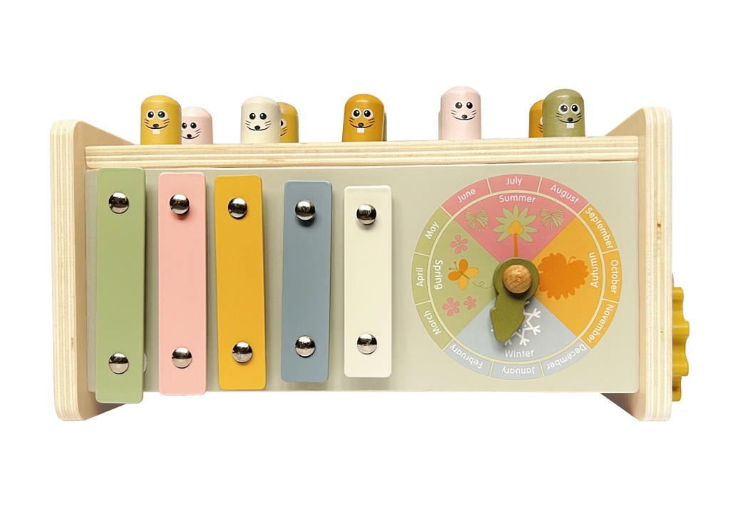 Poškodený obal. Nový tovar bez závad. Zatĺkacia hra, lovenie rybičiek, otočné ozubené kolieska a vrtule, posuvný labyrint s kuriatkom, ručičkové hodiny… A to zďaleka nie je všetko! Táto bohato vybavená multifunkčná hračka ponúka deťom pestré možnosti, ako sa hrať a zároveň rozvíjať dôležité zručnosti. Súčasťou je veselá zatĺkačka s krtkami a drevené kladivko, s ktorým si deti precvičujú silu úderu a presnosť. Magnetická udica slúži na chytanie farebných rybičiek, čo pomáha rozvíjať trpezlivosť, koordináciu a jemnú motoriku. Nechýba ani farebný xylofón s paličkou, ktorý rozvíja hudobný sluch a zmysel pre rytmus. Vďaka mnohým rôznorodým aktivitám táto drevená hračka zabaví deti na dlhú dobu a podnecuje ich zvedavosť, logické myslenie aj zmyslové vnímanie. Všetko je vyrobené z kvalitného a bezpečného dreva v pastelových farbách s motívmi zvieratiek. Xylofón nie je hudobný nástroj, jedná sa iba o hračku. Hlavné vlastnosti: 8 dielovzatĺkacia hra, kladivko, udice, paličkamultifunkčná hračkapodnecuje vnímavosť, logické myslenie a zmyslové vnímaniepodporuje jemnú motoriku a koordináciu ruka-okovhodné pre deti od 2 rokov