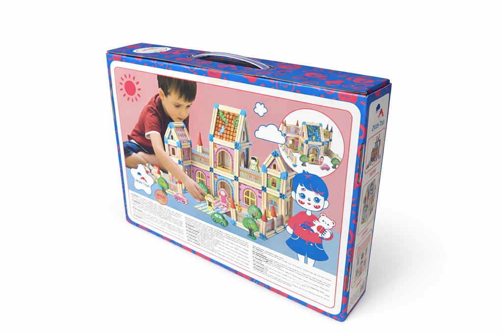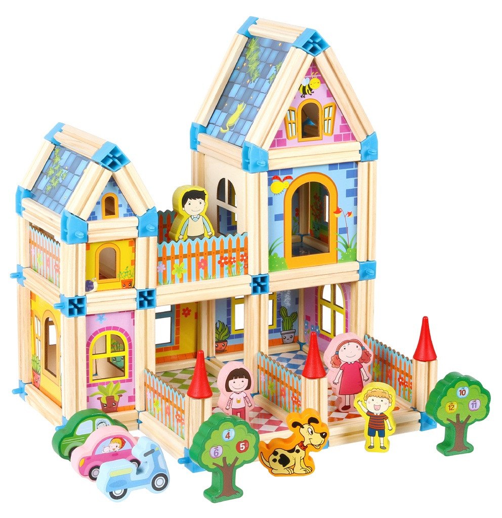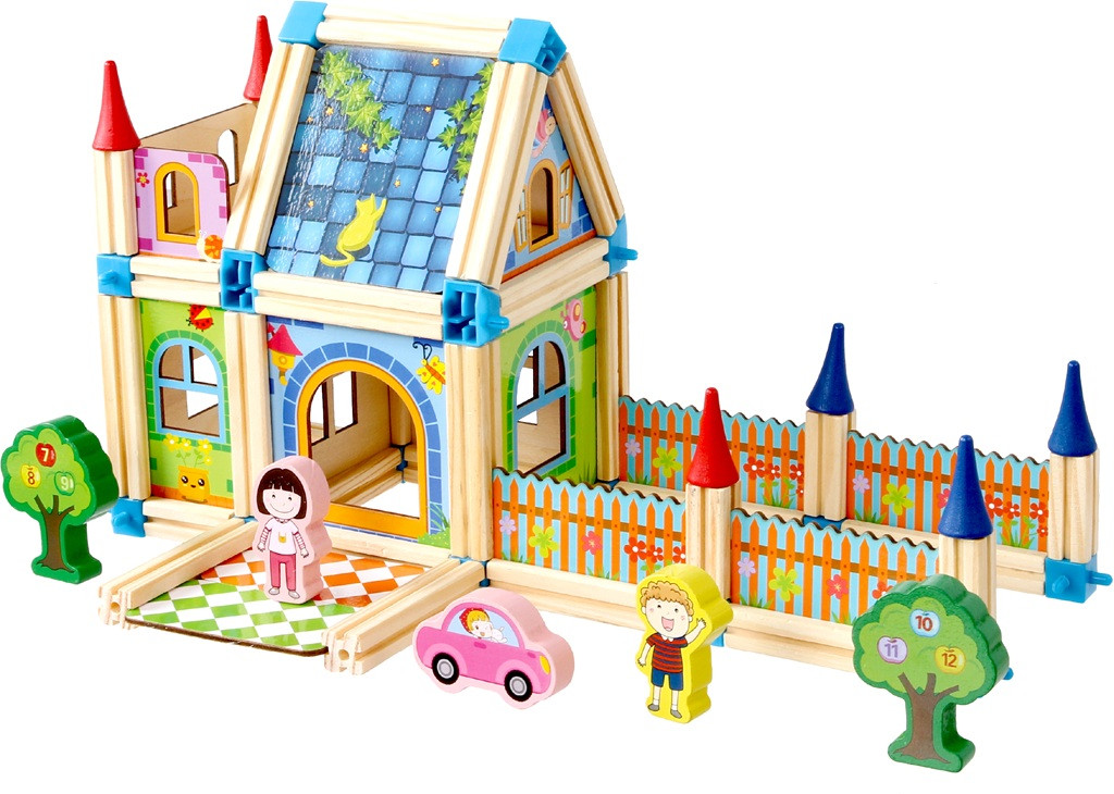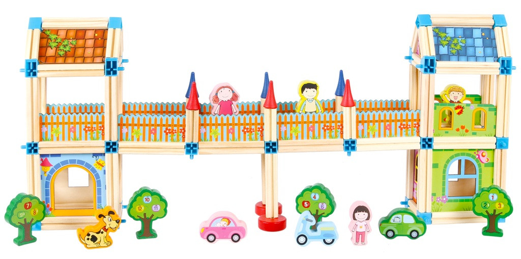 Ezzel a színes építőkészlettel a fantázia valóban szárnyra kap. A készlet 268 darab fa elemet és műanyag csatlakozót tartalmaz, amelyekből kastélyok, paloták, házak vagy bármilyen egyedi építmény megalkotható.