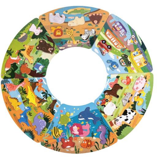 Ez a különleges készlet 6 egymással összekapcsolható fa puzzle-t tartalmaz, amelyek együtt egy nagy, kör alakú világot alkotnak. A jelenetekben házi- és vadállatok, tengeri élőlények, közlekedési eszközök és dinoszauruszok jelennek meg.