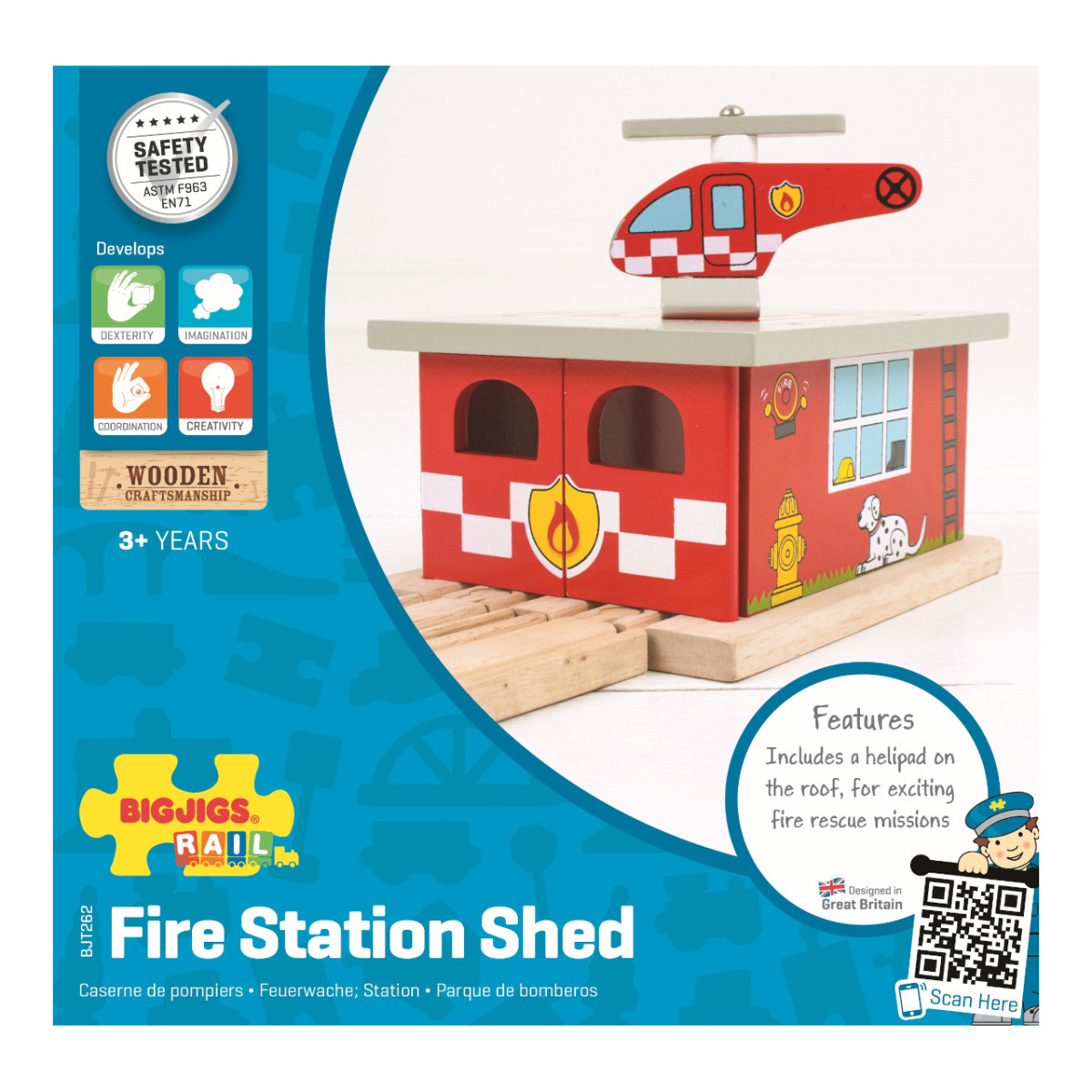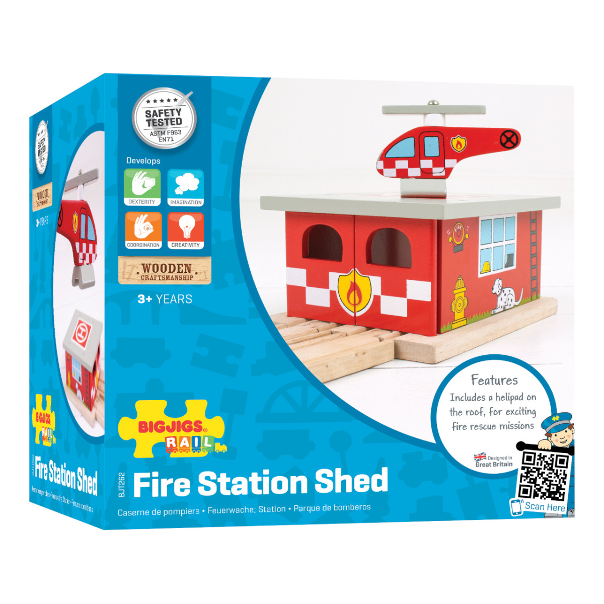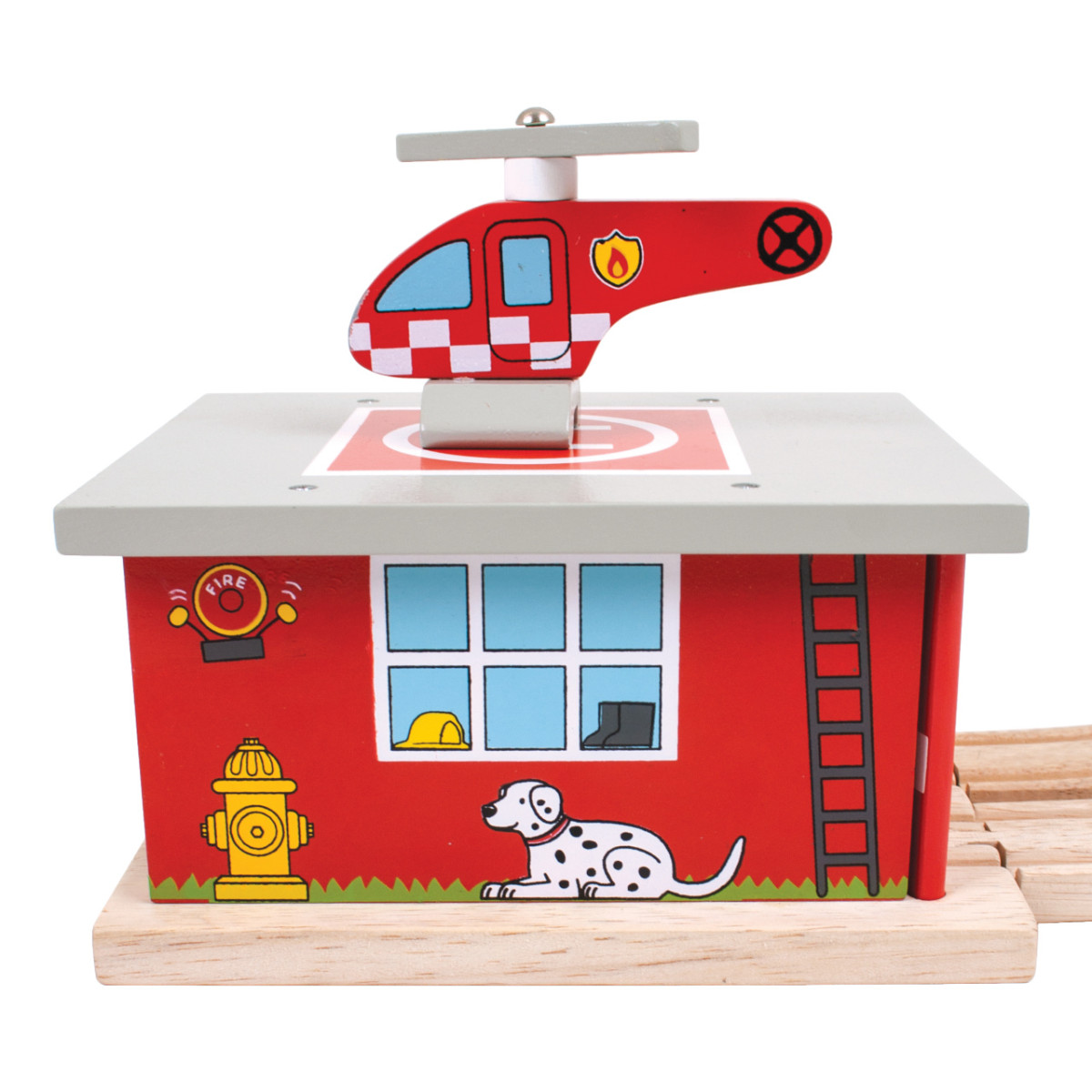 A Tűzoltó depó állomás tökéletes pihenőhely a mentővonatok számára. A készlet egy helikoptert is tartalmaz, így még izgalmasabbá válik a mentős szerepjáték. A gyerekek eljátszhatják, hogy a tűzoltók visszatérnek a bázisra egy bevetés után. Kiváló minőségű, természetes faanyagból készült, biztonságos és tartós. Kompatibilis minden Bigjigs Rail és más fa sínrendszerrel. A játék során fejlődik a kreativitás, kézügyesség és koordináció. Tökéletes kiegészítője a tűzoltós témájú pályáknak.