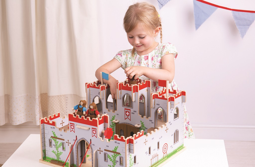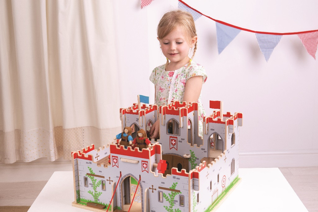 A Bigjigs Toys által készített „György király vára” egy varázslatos fa játék vár, amely tökéletes minden kis kalandor számára. A vár 45x31x45 cm méretű, és ideális választás a 3 éves vagy annál idősebb gyerekek számára. A részletekben gazdag kialakítás lehetővé teszi a gyerekek számára, hogy bátran szárnyaljon a fantáziájuk és megéljék a középkori kalandokat.