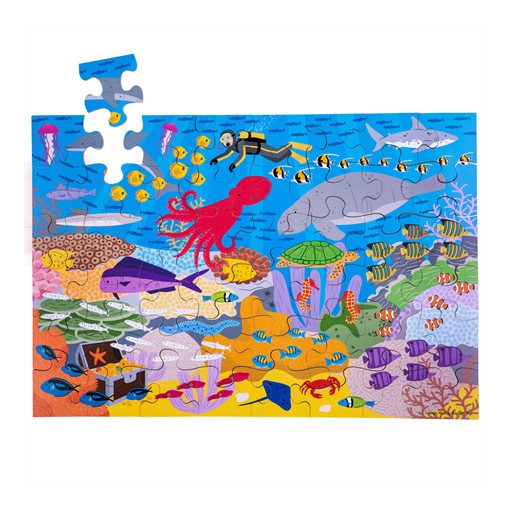 Fedezd fel az óceán varázslatos világát a Bigjigs Toys padlópuzzle segítségével! Ez a 48 darabos puzzle lenyűgöző tengeri jeleneteket ábrázol, amelyek ösztönzik a gyerekek kreativitását és képzelőerejét. Kiváló minőségű fából készült, így tartós és biztonságos minden 3 éves és annál idősebb gyermek számára. A puzzle mérete 58x40 cm, így elegendő helyet biztosít a részletek alapos megfigyeléséhez.