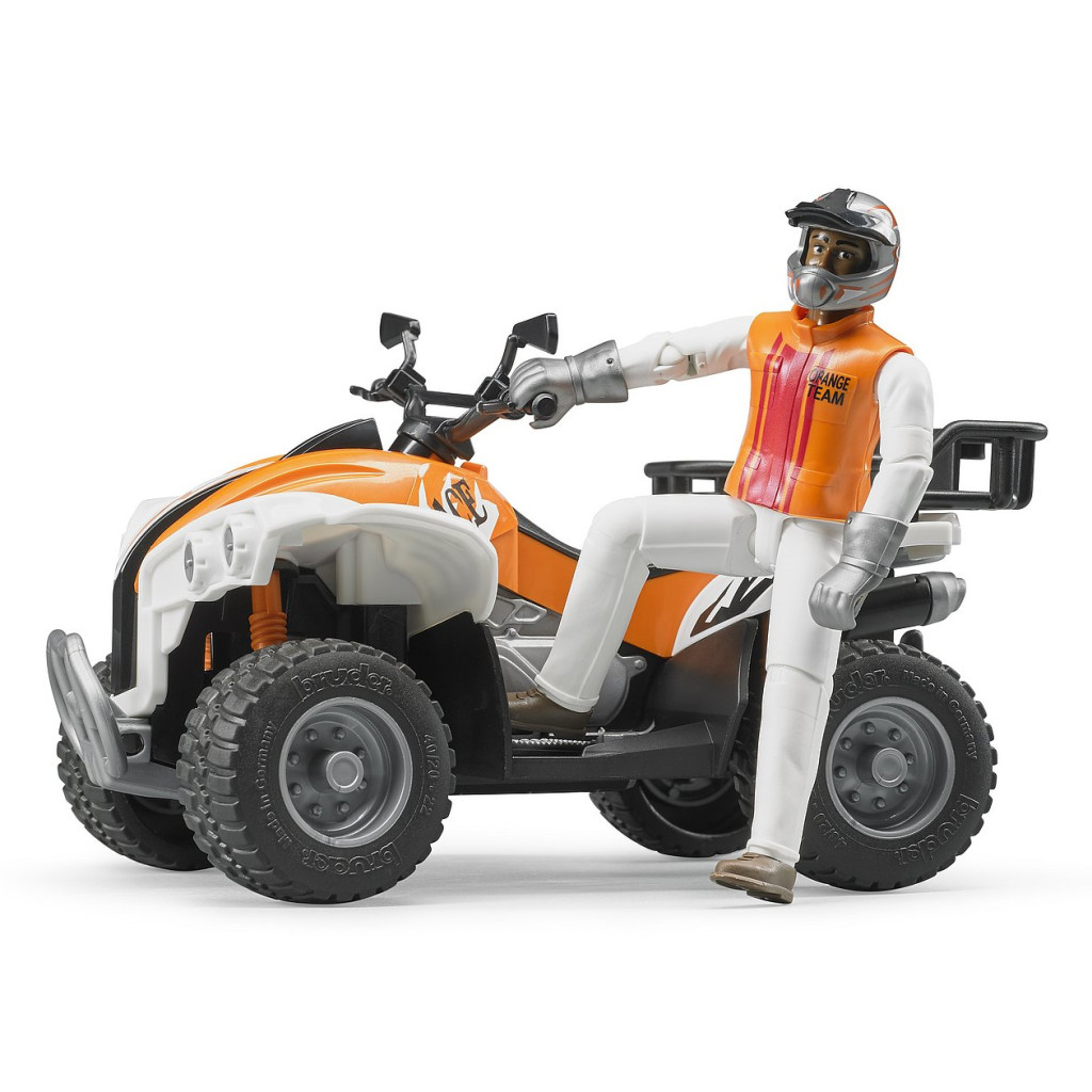 A Bruder BWORLD quad vezetőfigurával egy részletes munkajármű mozgatható kerekekkel és rugózott futóművel. A hátsó csomagtartó levehető, a quad gumiabroncsai mintázottak. A vezetőfigura bukósisakot és motoros felszerelést visel, végtagjai mozgathatók.