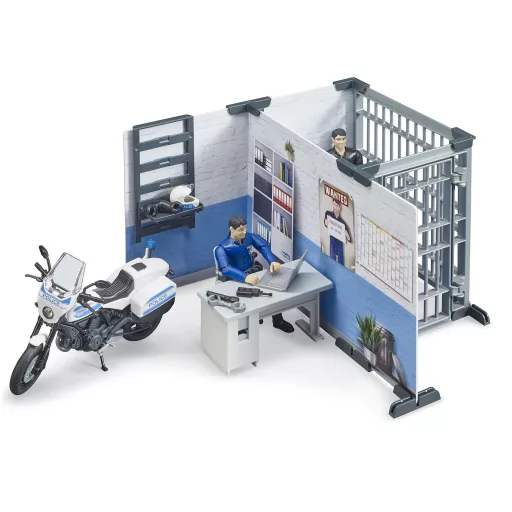 Pre širokú škálu policajných vozidiel BRUDER je tu nová policajná stanica BWORLD ako koordinačné centrum. V kancelárskej časti môže policajt koordinovať a sledovať každú misiu pomocou najmodernejšieho vybavenia. Ak je chytený podozrivý, môže byť zadržaný cele. Policajný motocykel Scrambler Ducati pred policajnou stanicou je pripravený vyraziť do akcie. Stanicu možno ľahko kombinovať s ostatnými sadami BWORLD. Ponúkajú sa pre ňu doplnky v podobe policajných vozidiel. Vyrobené v Nemecku, z kvalitných materiálov. Hlavné vlastnosti: figúrka policajta s vybavením a motocyklom, figúrka zadržaného2 obojstranne potlačené stieny stanice, 2 diely mreží vrátane dverípolicový diel, stoličky, stôl, posteľ a notebookvyrobené v Nemecku