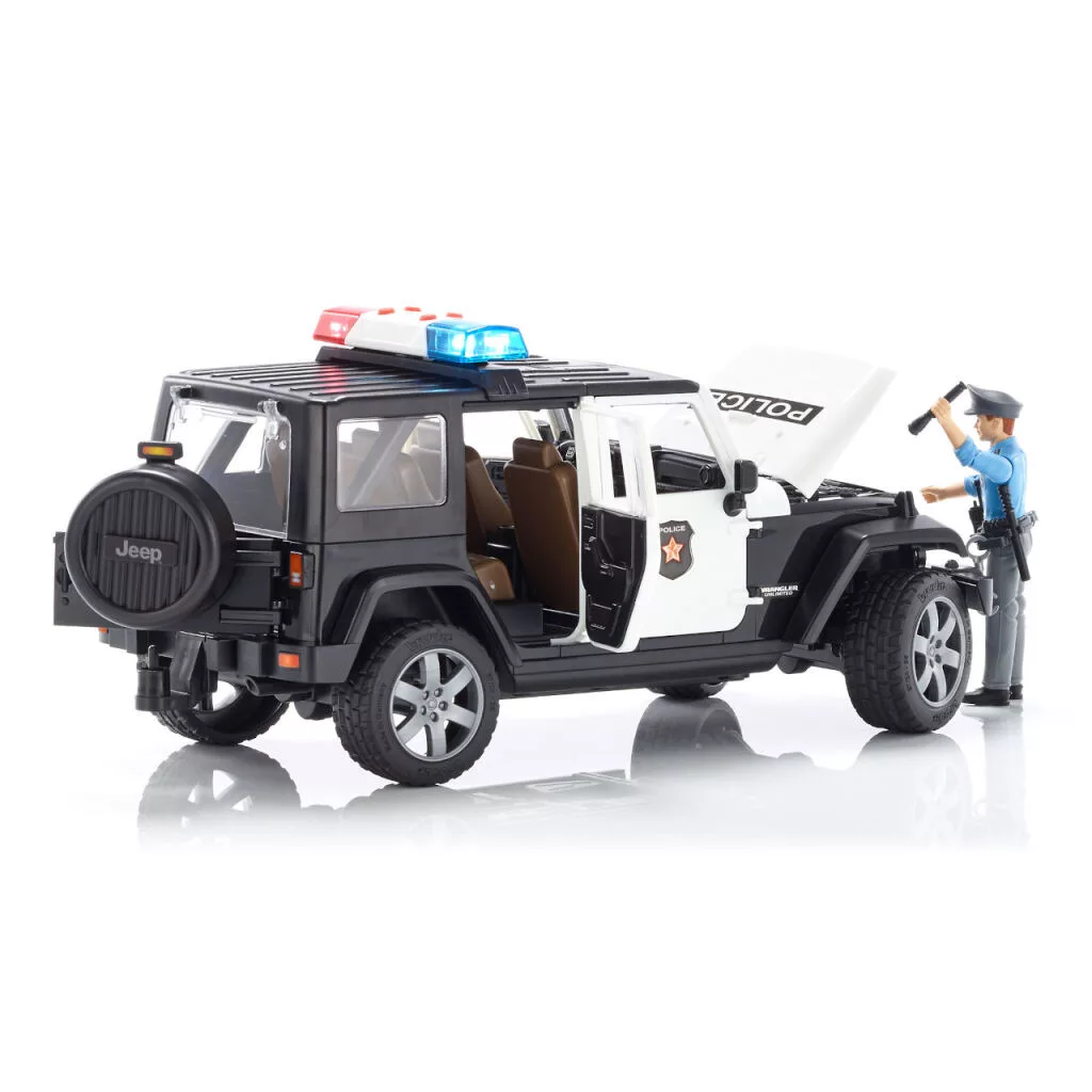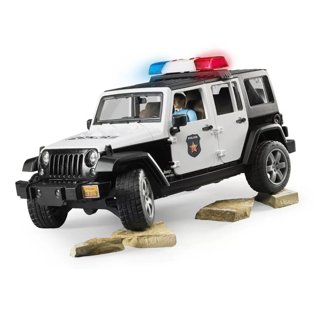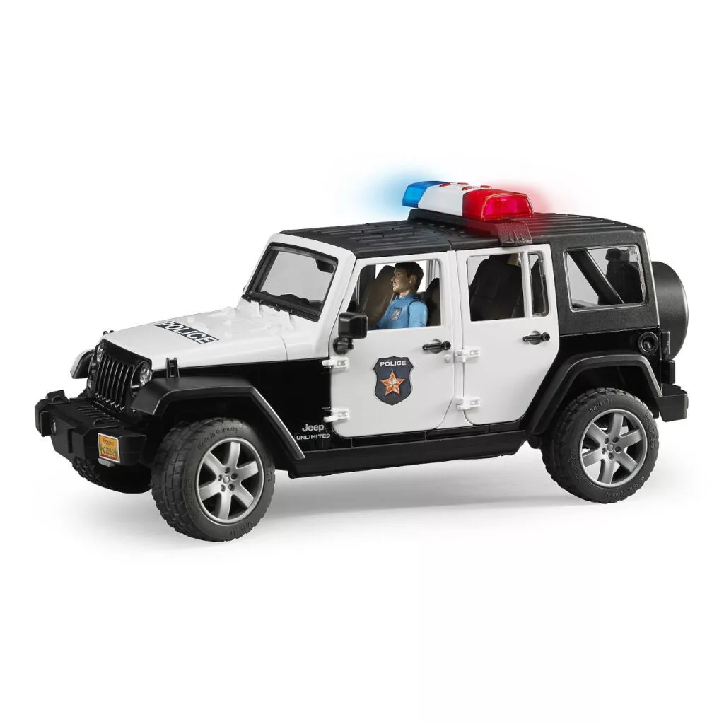 A rendőrségi Jeep Wrangler Rubicon részletes kidolgozásával és rengeteg funkciójával nyűgöz le. Levehető kétrészes tetővel, nyitható ajtókkal és motorháztetővel, valamint mozgatható futóművel rendelkezik. A csomag tartalmaz egy rendőr figurát is teljes felszereléssel, valamint hang- és fényjelző modult.