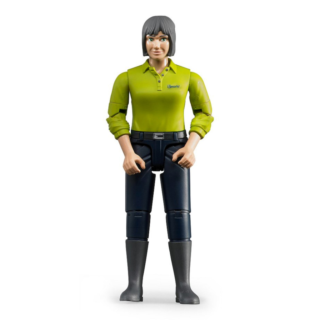 Klasszikus BWORLD női figura mozgatható végtagokkal, 10,7 cm-es méretben. Jól használható városi, farmos, műhelyes vagy logisztikai jelenetekhez is, bármely Bruder jármű mellé.