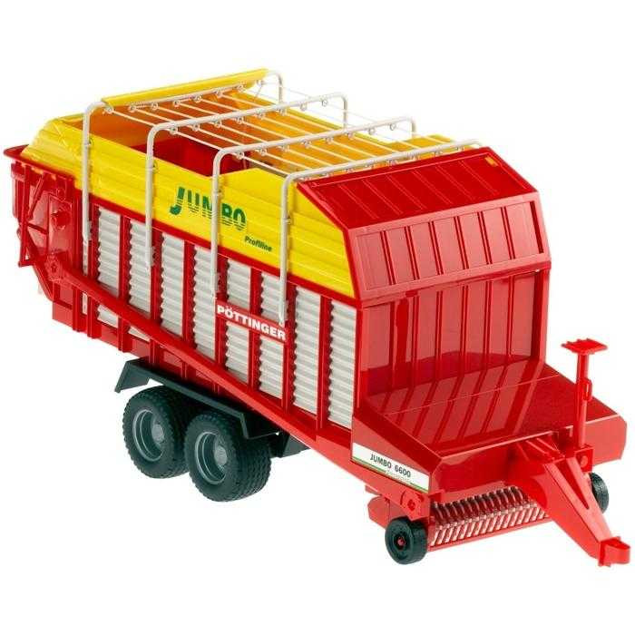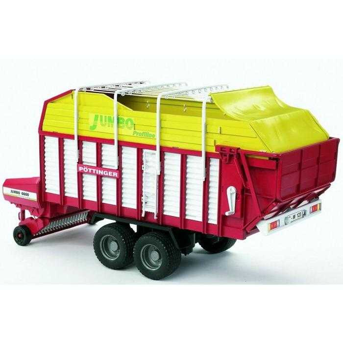 A Pöttinger Jumbo szénagyűjtő egy látványos, jól működtethető pótkocsi: stabil kitámasztó lábbal önállóan is megáll, az oldalfalak nyithatók (lehajtható létrával), a hátsó rész nyitható, a belső hengerek pedig kézi tekerőkarral mozgathatók. Bruder 20xx, 21xx, 30xx traktorokhoz csatlakoztatható.