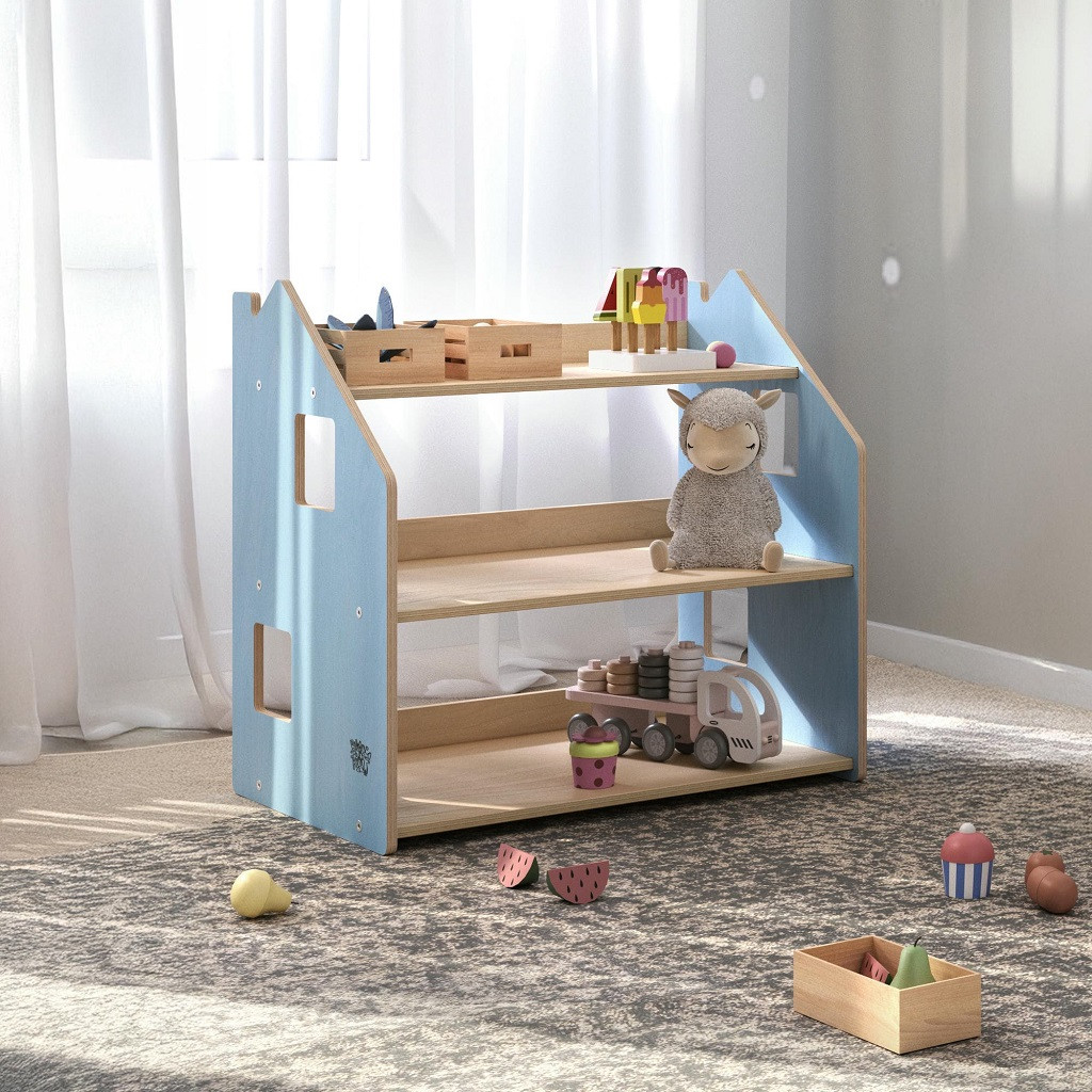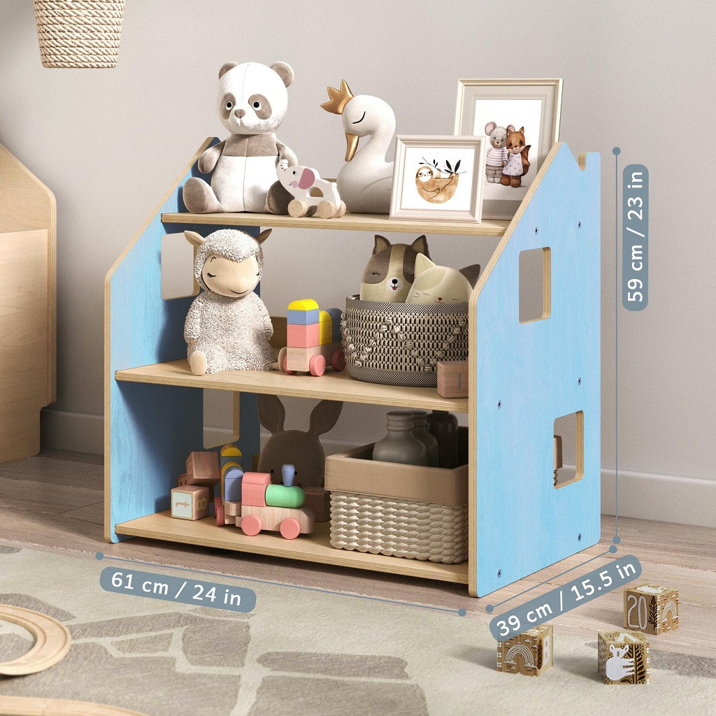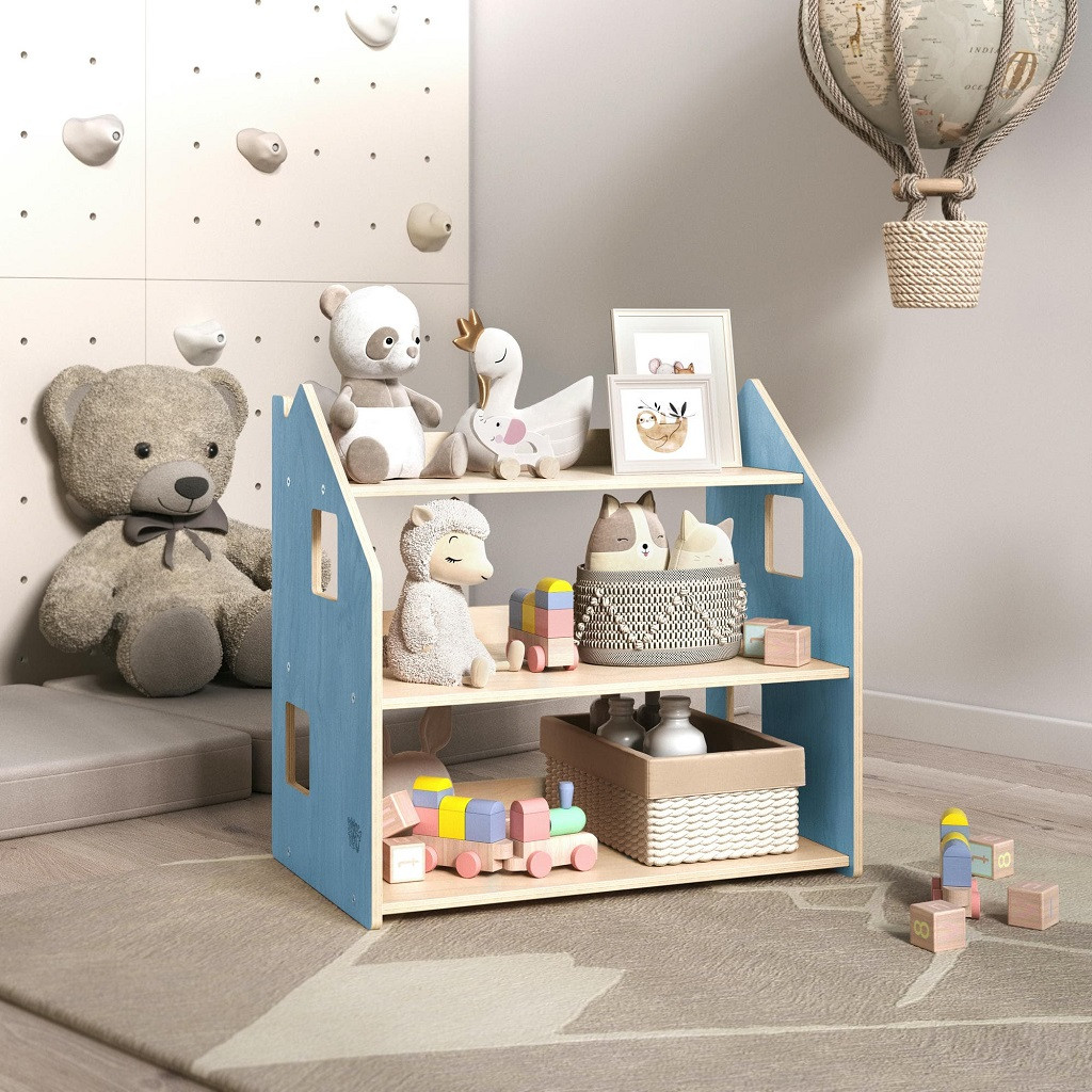 Ugyanaz a praktikus, 3 polcos tároló, kék színben: segít, hogy a gyerekek a saját tempójukban tanuljanak meg rendet rakni, és a játékaiknak legyen fix helye. Stabil, biztonságos, lekerekített élekkel, gyors összeszereléssel.