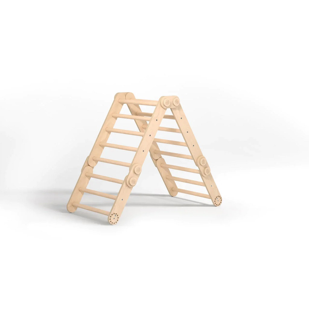 A szivárványos verzió natúr párja: ugyanaz a kompakt, variálható mászószett, természetes fa megjelenéssel.