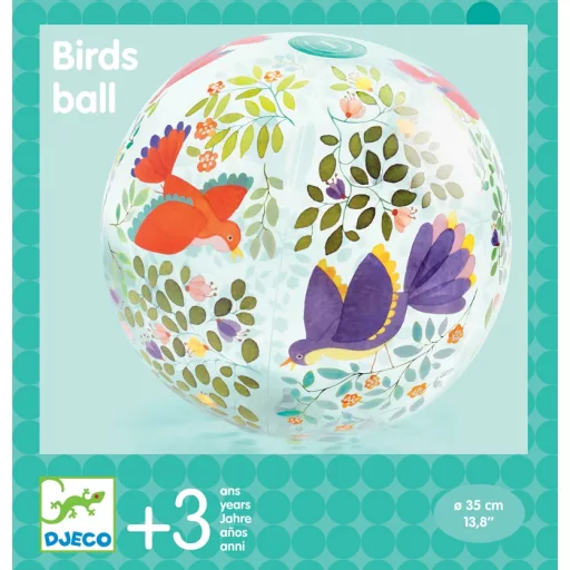 A Madárkás labda egy nagy felfújható labda (átmérője 35 cm) a vízi játékok és a madarak témájára, tele rajzolva sok kis színes madárkával. Könnyű és könnyen szállítható, ideális társ a szabadtéri játékokhoz vagy a vízben való szórakozáshoz.