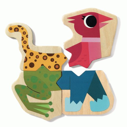 24 mágneses darabból álló, fából készült készlet, amiből állatokat lehet felépíteni. A puzzle részeken a bevágások lehetővé teszik a darabok jobb egymáshoz illesztését. Egy-egy állatfigura puzzle részei azonos színűek, hogy látni lehessen mi, mihez tartozik. Minden állatfigurának más színe van, hogy könnyebben szétválogathatóak legyenek. 6 db, 4 darabból álló állatfigurát lehet kirakni belőle. A készlet dobozban van a könnyű tárolás érdekében.