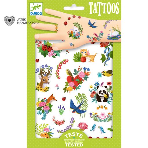 A Djeco Vidám tavasz tetoválómatrica csomagolása 2 ív tavasz ihlette "tetoválást" tartalmaz. A motívumok közt megjelennek a tavaszi virágok és a kedves tavaszi állatok is, az illusztrációk a Djeco-tól megszokott igényességet és részletgazdagságot ezúttal is hozzák.