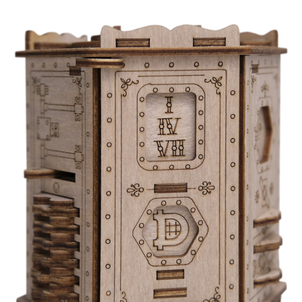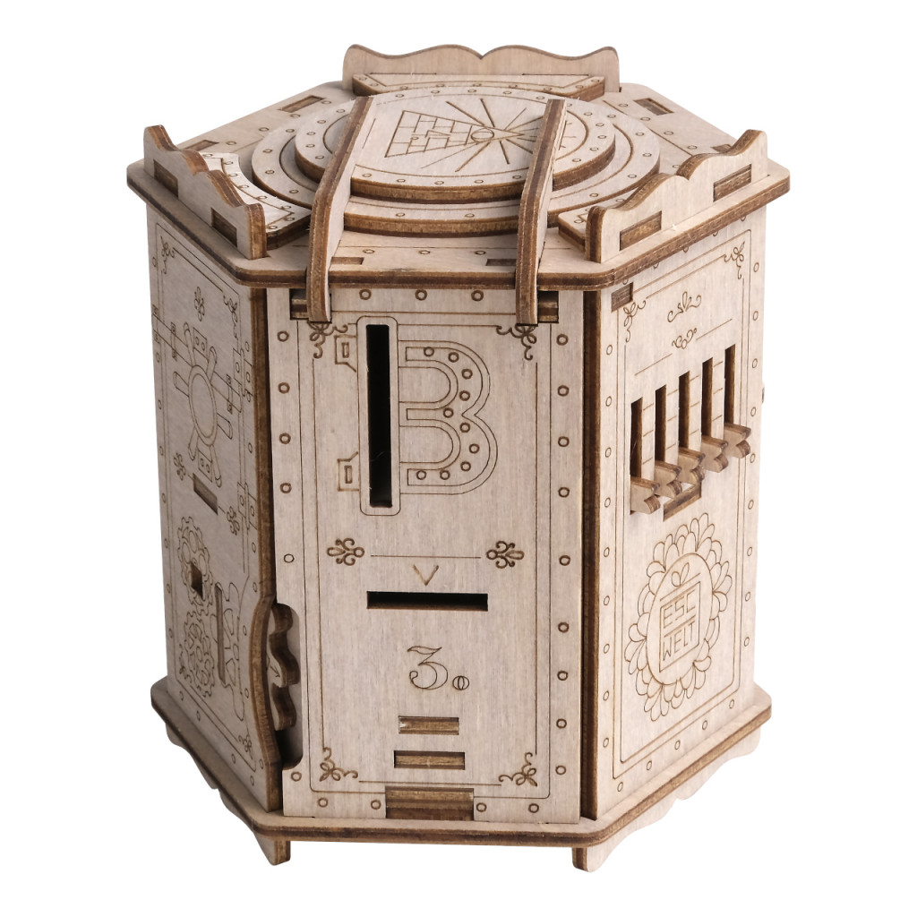 Rejtélyek és páncélszekrények világa 73 precízen vágott elemből. Előbb megépíted a masszív „trezort”, majd kódokat, mechanizmusokat fejtve jutsz a 9×9×4 cm-es titkos rekeszhez. A történet Al Capone legendás érméjéhez kapcsolódik – a hangulat garantált, akár egy miniszabadulószoba az asztalon. Nincs szükség ragasztóra, a csapolt kötésektől a szerkezet feszes és újrajátszható. A részletes képes útmutatóhoz QR-es súgó is tartozik. Haladóknak ajánlott, magas nehézségű modell és fejtörő egyben; kreatív ajándékdobozként is sziporkázik. EU-gyártás, természetes nyírfa.