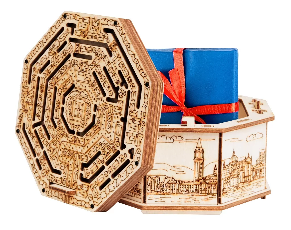 Látványos fa labirintus, amely csak okos manőverekkel engedi feltárni a 10×10×4,5 cm-es belső rekeszt. Ideális pénz vagy üzenet „küldetésként” való átadásához: a címzettnek előbb le kell győznie az útvesztőt. A doboz masszív, csapolt szerkezetének köszönhetően ragasztó nélkül is hosszú életű és újrajátszható. Közepes nehézség, jól követhető útmutatóval; családi programnak és party-feladványnak is remek. Fenntartható, elegáns és emlékezetes csomagolás, EU-ban készült természetes fából.