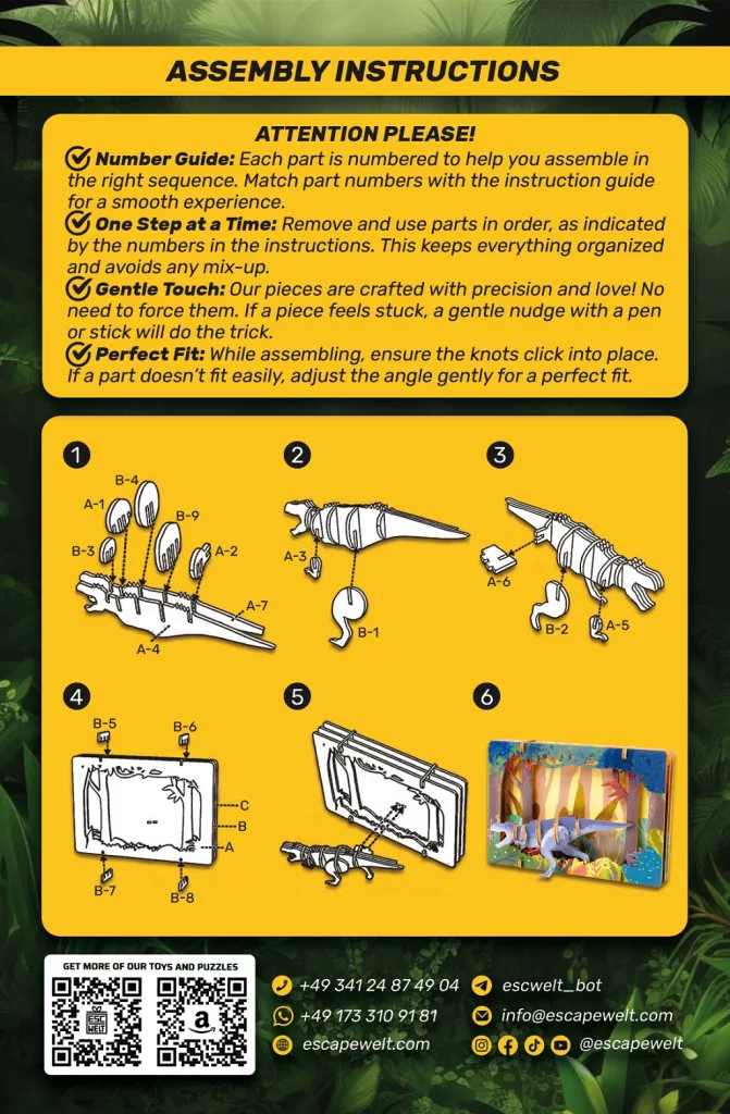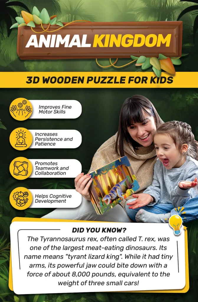 Izgalmas és tanulságos játék minden dinoszaurusz rajongónak! Ez a 3D fa puzzle nemcsak szórakoztat, hanem fejleszti a térbeli gondolkodást és a finommotorikát is.