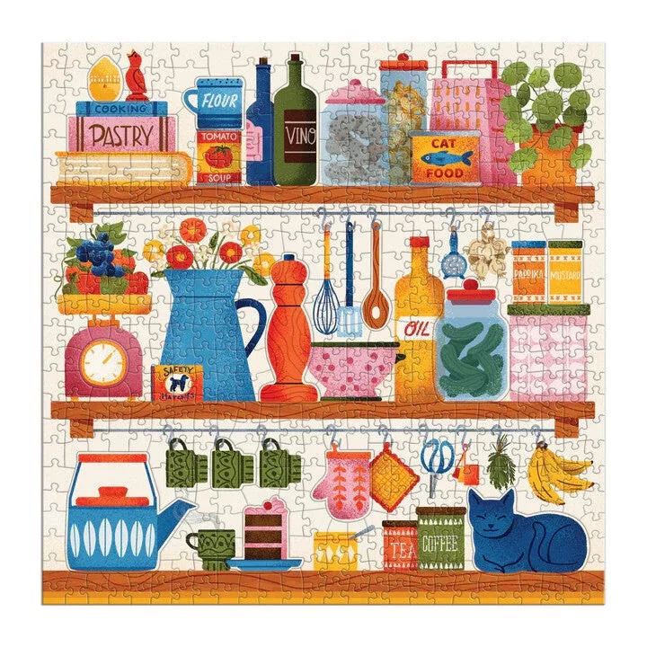 Ez az 500 darabos puzzle egy illusztrált polcot mutat be, tele konyhai eszközökkel és apró részletekkel. A változatos motívumok miatt a kirakás egyszerre pihentető és izgalmas, így tökéletes választás egy nyugodt délutánra vagy egy kis énidőre.
