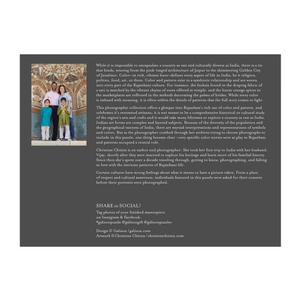 Ez az 1000 darabos puzzle Rádzsasztán színeit, textúráit és gazdag hangulatát idézi meg 32 fotón keresztül Christine Chitnis könyvéből. A részletgazdag képek szépen összekapcsolják a látványos helyszíneket, így a kirakás közben is könnyű elmerülni a színekben és mintákban.