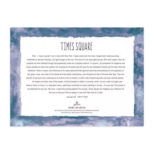 Ez az 1000 darabos puzzle a híres Times Square nyüzsgő világát mutatja be. Michael Storrings részletgazdag városi jelenete hosszabb, tartalmas kikapcsolódást kínál, miközben a sok apró elem végig érdekesen tartja a kirakást.