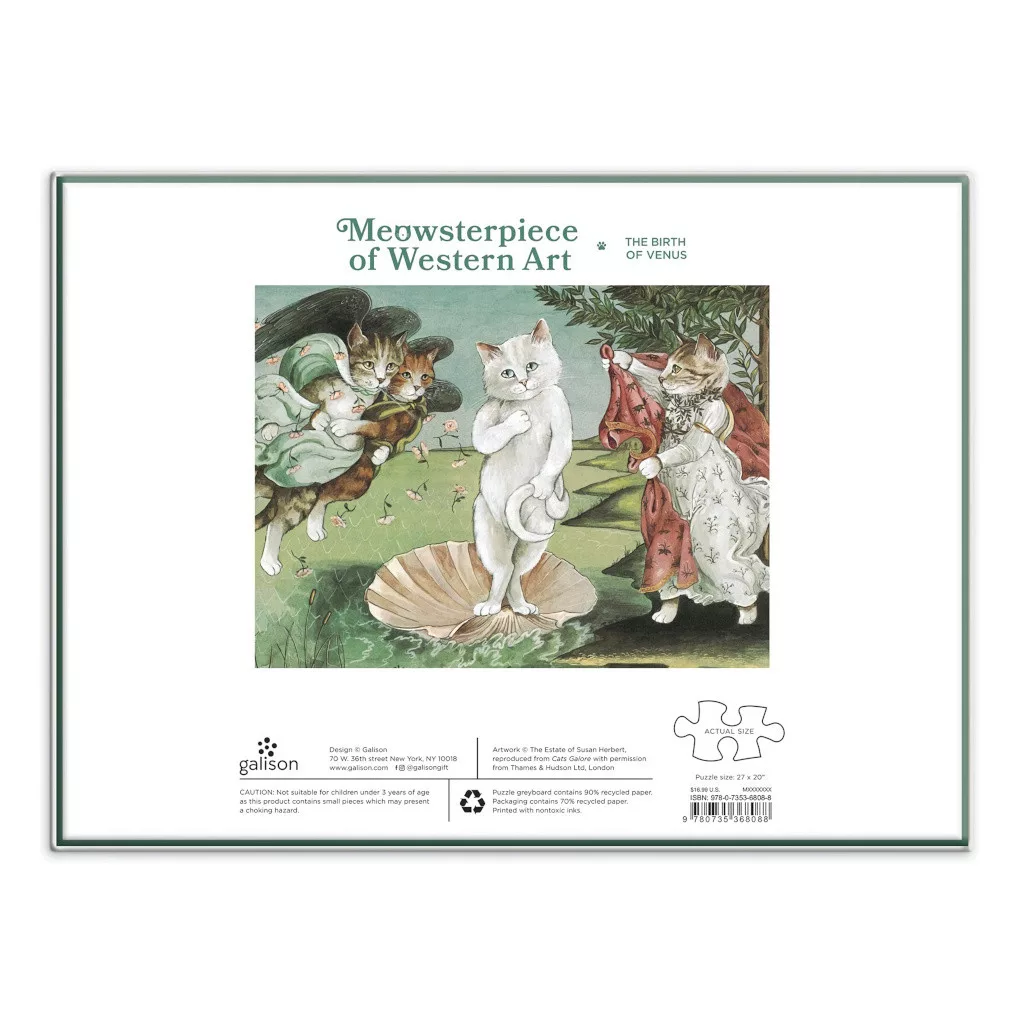 A Galison Vénusz születése puzzle Susan Herbert macskás stílusban újragondolt, játékos paródiája egy klasszikus műalkotásnak. Különleges választás macskarajongóknak és azoknak, akik szeretik a humoros, mégis művészi kirakókat.