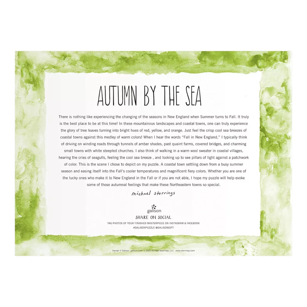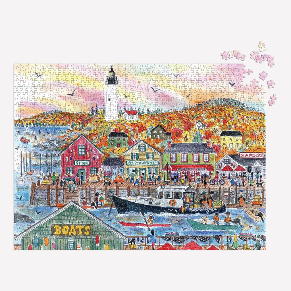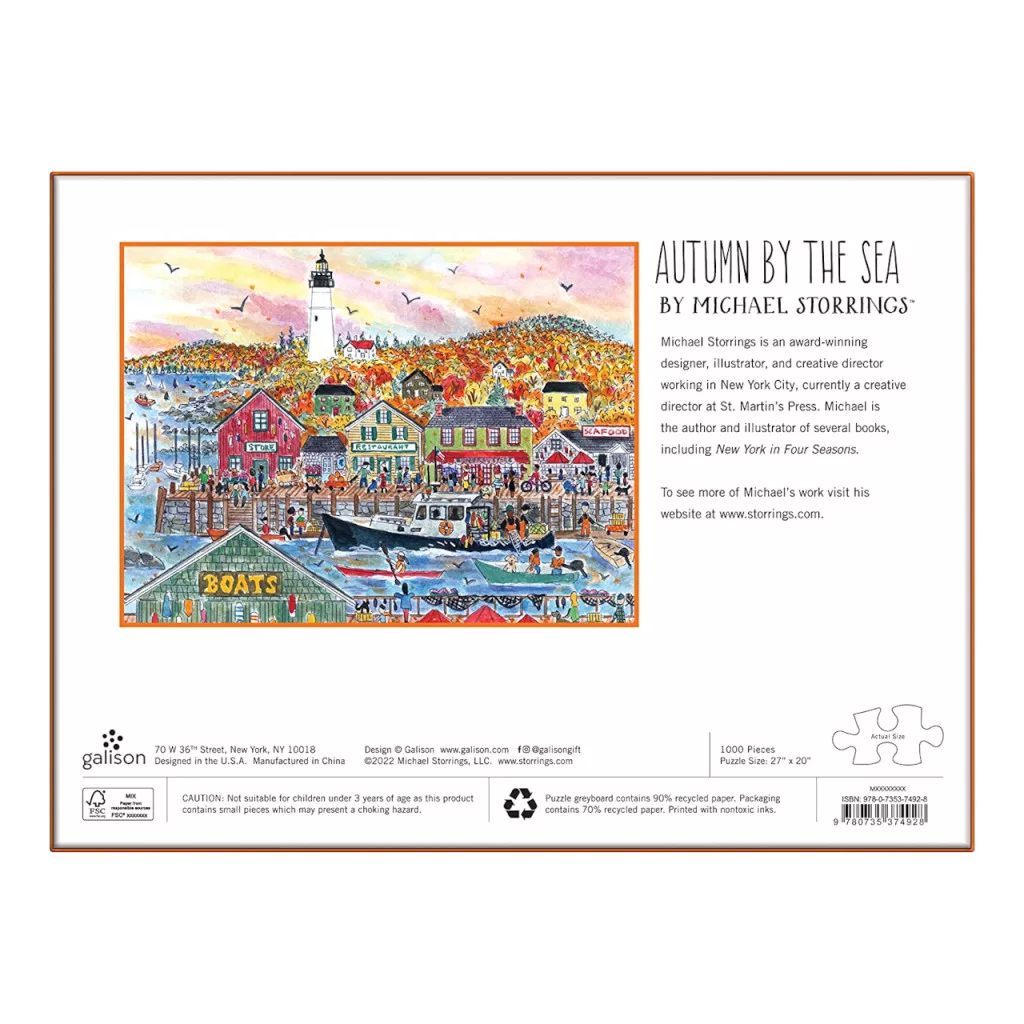 Ez a puzzle egy őszi hangulatú tengerparti várost mutat be Michael Storrings illusztrációján. A meleg színek és részletek segítenek ellazulni és kiszakadni a mindennapokból.