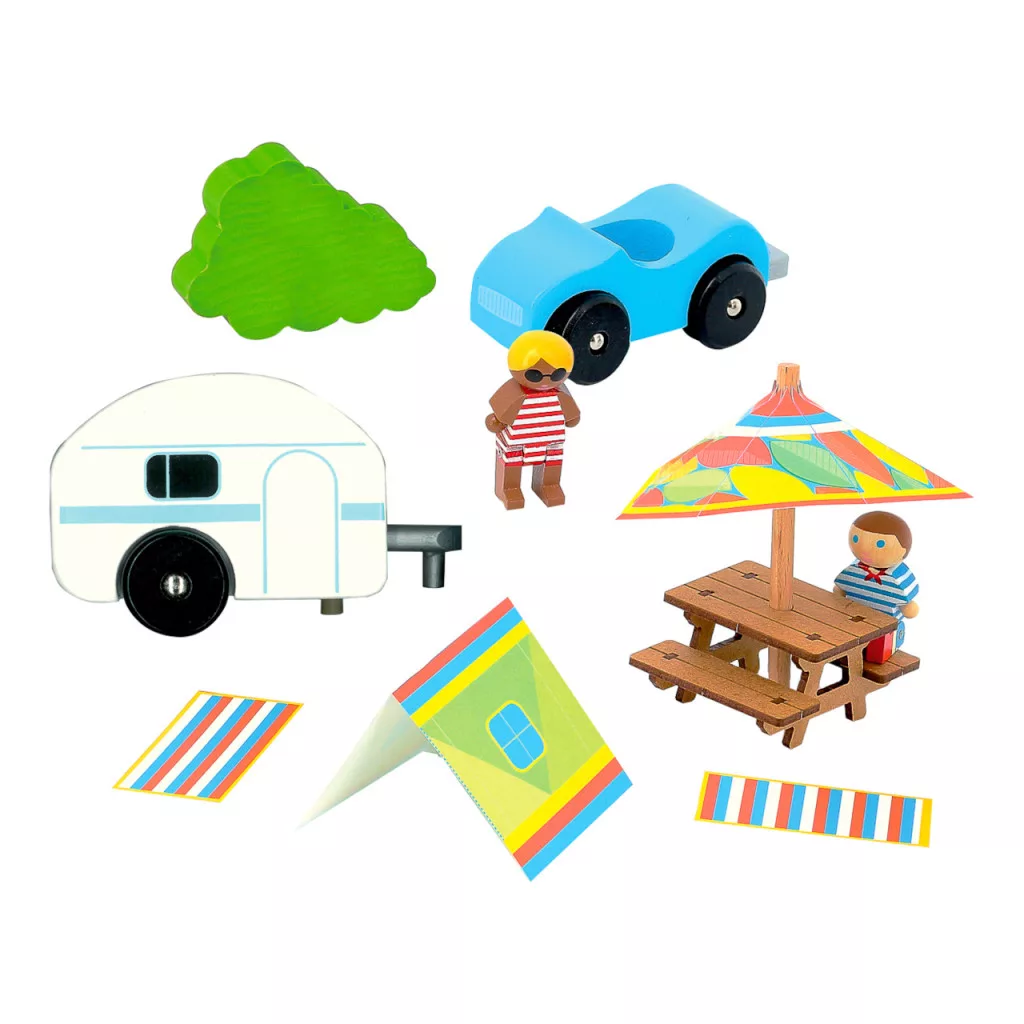 Ez a kempingezős figura szett igazán kedves kiegészítője lehet a Jeujura építőjátékoknak. A két mozgatható figura, az autó, a lakókocsi és a kiegészítők segítségével gyermeked könnyen eljátszhatja a nyaralás vidám pillanatait.