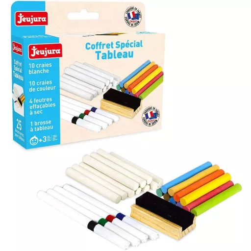 Ideálna sada pre kreatívne dietky. Balenie obsahuje 10 bielych kried, 10 farebných kried, 4 farebné popisovače na bielu tabuľu a 1 hubku s drevenou rukoväťou. Hlavné vlastnosti: 10 ks bielych kried, 10 ks farebných kried, 4 farebné popisovače, hubkavyrobené vo Francúzsku