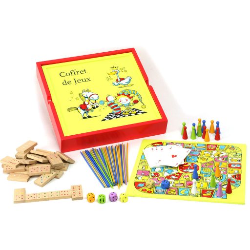 Súbor stolových, doskových hier a kariet v atraktívnom a praktickom prevedení. Obsahuje dámu, mlyn, hus, hady a rebríky aj človeče nehnevaj sa. Súčasťou je tiež mikádo, domino a balíček bridžových kariet. Balené v robustnom boxe z masívneho dreva.   Hlavné vlastnosti:stolové, doskové aj kartové hryatraktívne ilustrovanépraktické balenie
