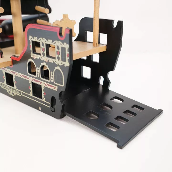 Le Toy Van - Barbarossa kalózhajó: Ikonikus fekete vitorlás rengeteg funkcióval: őrkosár, palló, kötelek, rugós ágyú golyókkal, horgony csörlővel, nyitható tat és lejárat a fedélzet alá. Műanyagmentes, tartós fa; 10 cm-es figurákkal kompatibilis.