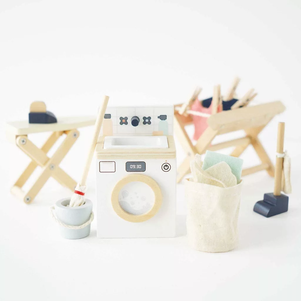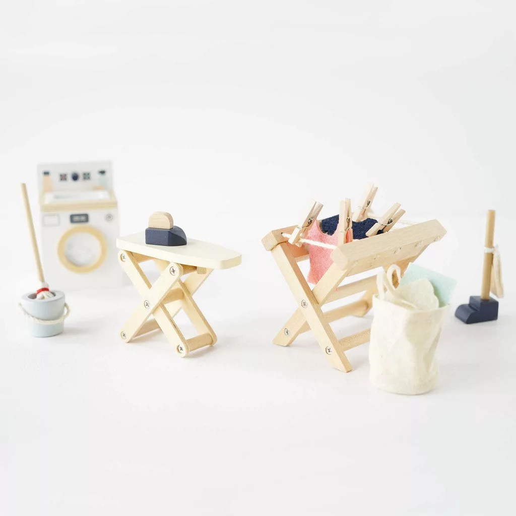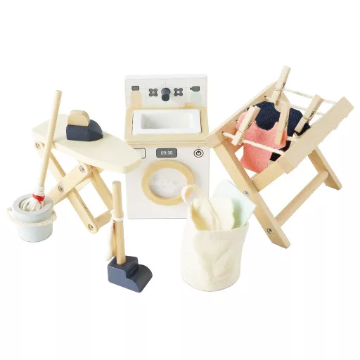 Le Toy Van - Mosókonyha bútorszett (1:12): 16 darabos, FSC-fából készült készlet: mosógép, szárítóállvány csipeszekkel, vasaló és vasalódeszka, felmosó, vödör, porszívó és filc ruhácskák. Részletgazdag kiegészítő bármely babaházhoz.