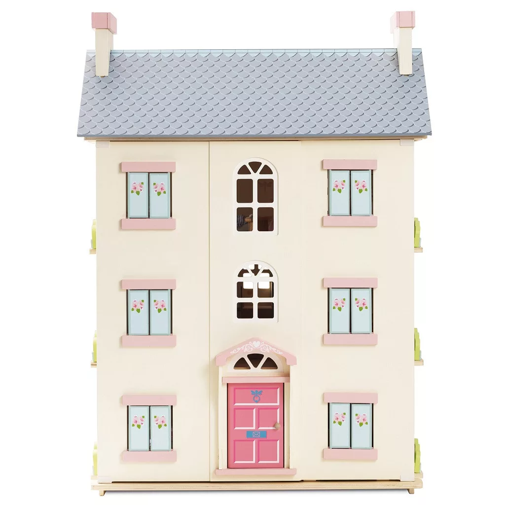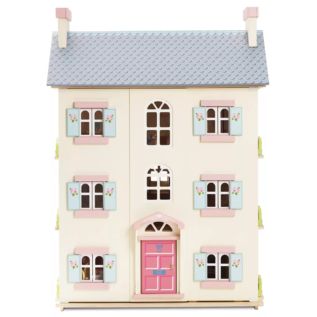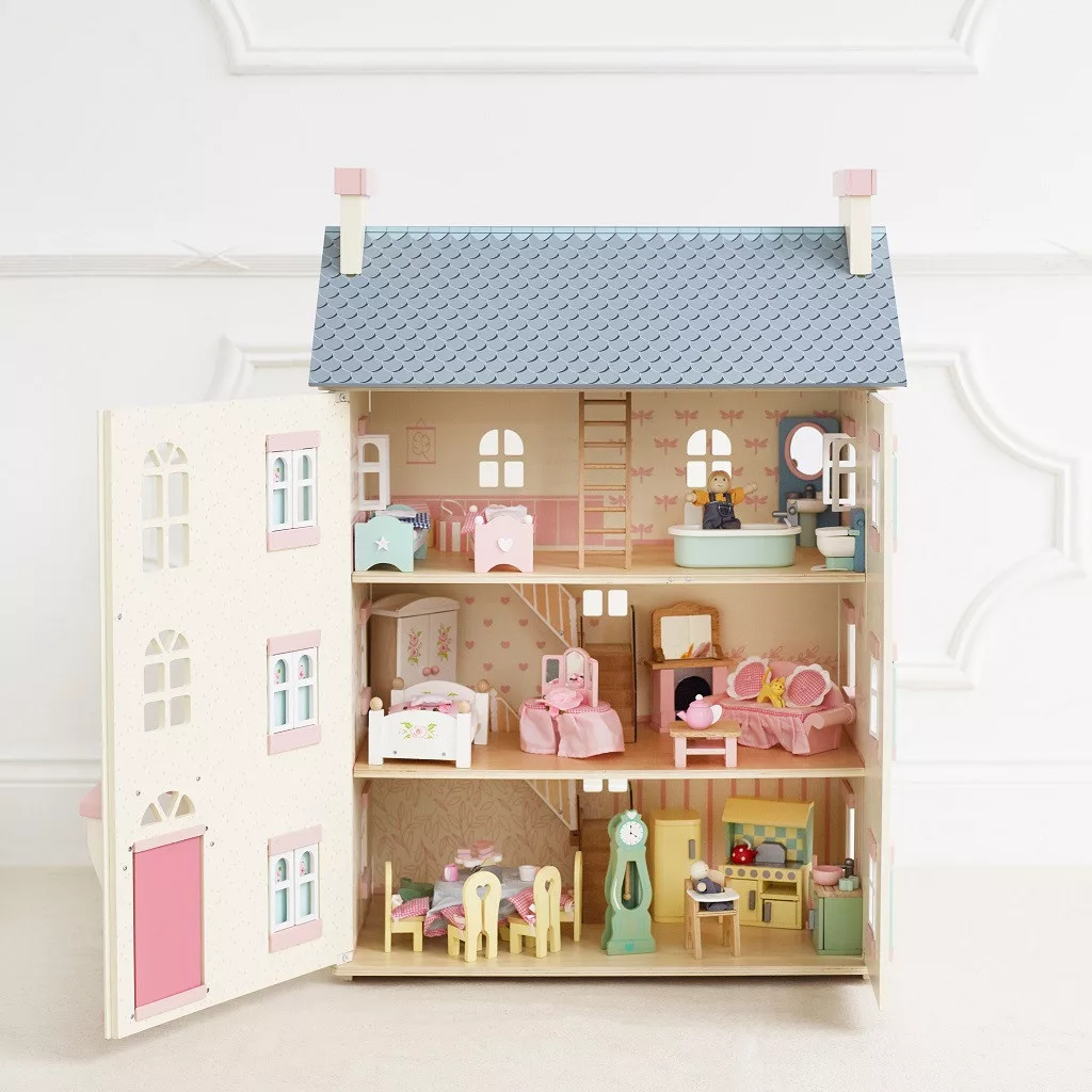Le Toy Van - Cherry Tree Hall babaház: Lenyűgöző, négyemeletes klasszikus villa két kéménnyel, nyitható homlokzattal és részletgazdag belsővel. Minden szint más dekorációt kapott, a díszes lépcső és a felnyitható tető padlásszobát rejt. FSC-tanúsított fa, vízbázisú festés; hosszú évekre tervezett, díjnyertes darab a Daisylane kollekcióból. A tágas belső tér testvéreknek is kényelmes közös játékot biztosít. Babák és bútorok külön kaphatók.