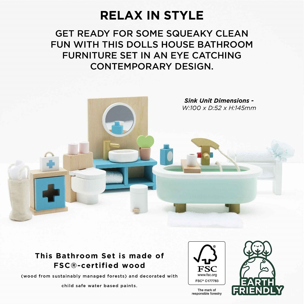 Le Toy Van - Daisylane fürdő (1:12): Retro hangulatú fa fürdőszobaszett: kád, WC, mosdó, törölközőtartó, elsősegély-szekrény és kiegészítők. Etikusan készült, tartós, kommunikációt és történetmesélést ösztönöz.