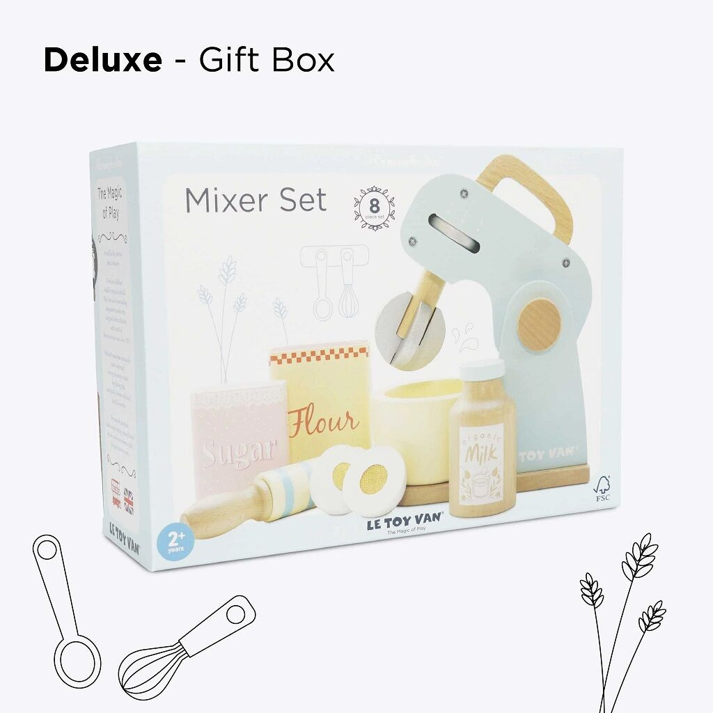 Le Toy Van - Állványos mixer szett: Mit süssünk ma? A retro állványos mixer forgó habverővel, fémes hatású gombbal és tálkával érkezik; a csomagban liszt, cukor, tej és tojás is van, plusz fa sodrófa. FSC-fa, vízbázisú festék, díjnyertes konstrukció. A szerepjáték során fejlődik a sorrendkövetés, a kézügyesség és a szókincs - a gyerekek tortát, kekszet „süthetnek”, és megélhetik az alkotás örömét. Tartós, esztétikus, műanyagmentes alapdarab a gyerekkonyhába.