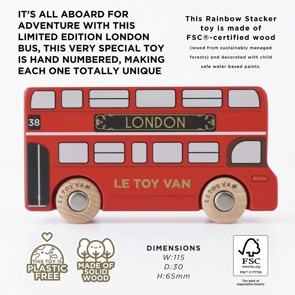 Le Toy Van - Limitált londoni busz (UK-gyártás): Kézzel számozott különkiadás (1000 db), klasszikus piros szín arany részletekkel, robusztus kerekekkel. FSC-fa, vízbázisú festék; garázsokkal és pályákkal kompatibilis.