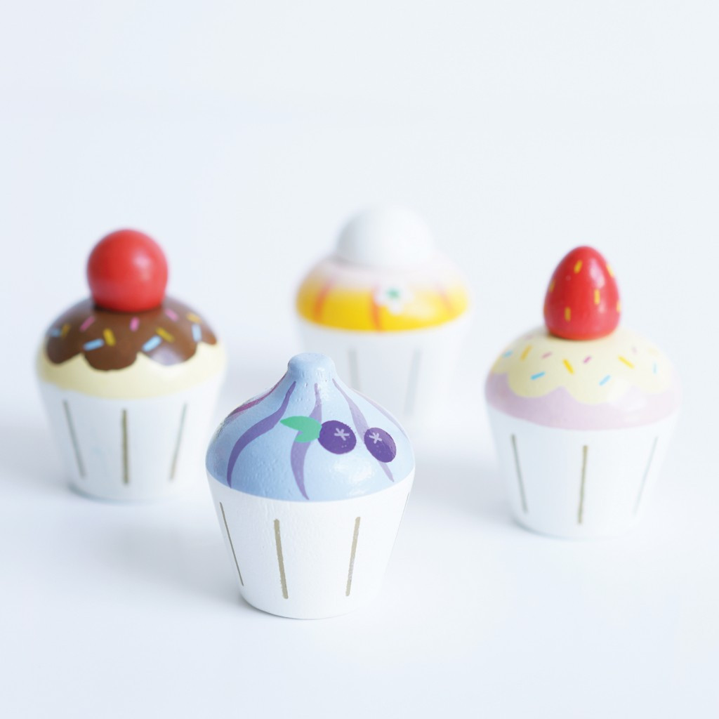 Le Toy Van - Muffin szett: Négy különböző „ízű” cupcake bájos díszítéssel. A masszív fa test és a sima, lekerekített forma biztonságos, a színek ellenállhatatlanok. A tálalás, osztás és „sütögetés” közben észrevétlenül fejlődik a kommunikáció és a szem-kéz koordináció. Honeybake minőség, játékkonyhába és kávézóba egyaránt.