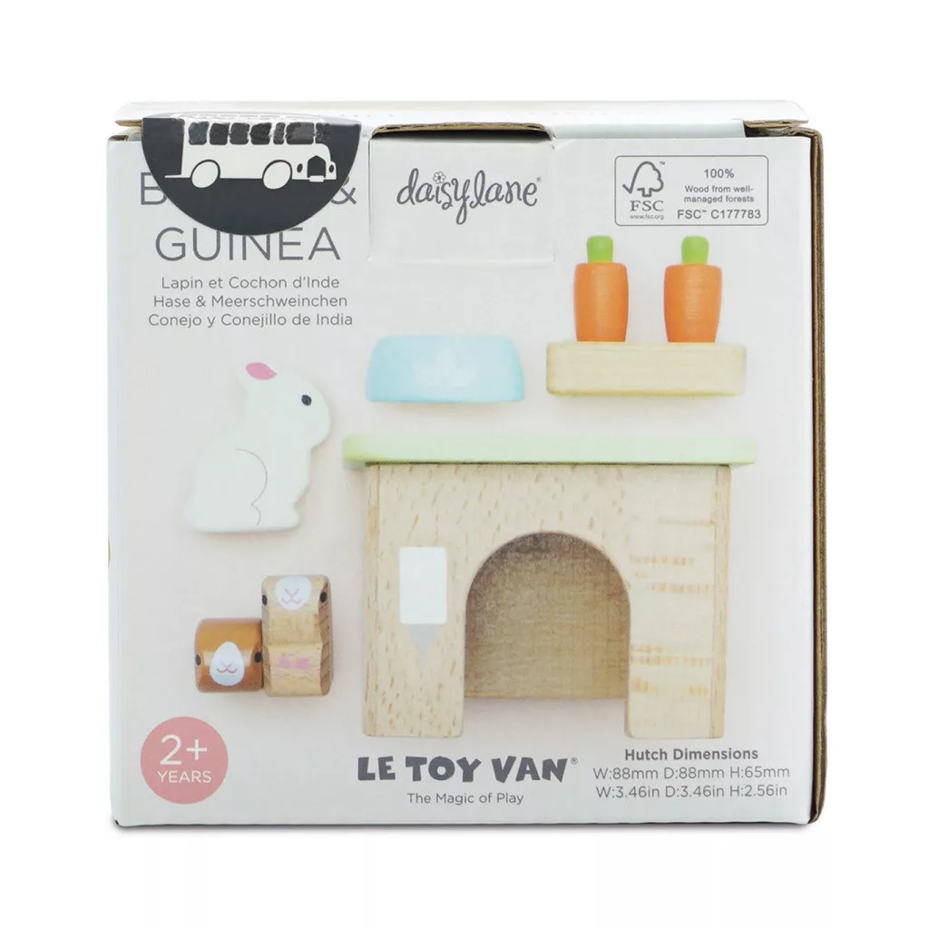 Le Toy Van - Nyuszi és tengerimalac szett: Aranyos kisállat-kiegészítő babaházhoz: nyuszi, két tengerimalac, házikó, tálka és „répás” finomságok. Szerepjátékra ösztönöz, kommunikációt fejleszt. FSC-fa, vízbázisú festék.
