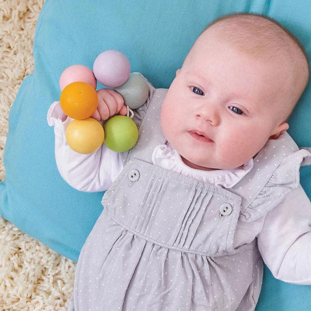 Le Toy Van Petilou - Gyöngyös rágóka: Fogzási időszakban nélkülözhetetlen társ. A rugalmas zsinórra fűzött hat fa gyöngy könnyen markolható, a színes festés pedig játékra csábítja a babákat. Fenntartható kaucsukfából készült, vízbázisú festékkel, újszülött kortól biztonságos. Segít a fogzás kellemetlenségeinek enyhítésében, közben fejleszti a tapintást és a vizuális érzékelést. Könnyen hordozható, babakocsiban is jól használható. Időtálló és természetes választás, amely mindig kéznél lehet.