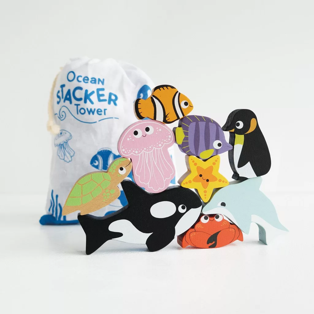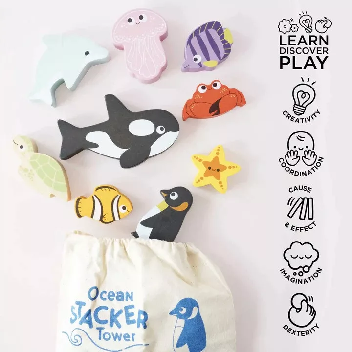 Le Toy Van Petilou - Óceán toronyépítő (9 állat): Bálna, delfin, csillag, pingvin, teknős, medúza és más tengeri barátok hívnak játékra. A 9 darabos szett a kézügyességet, a türelmet és a fantáziát is fejleszti, miközben a gyerekek új ismereteket szereznek az óceán élővilágáról. FSC-fa, vízbázisú festék, teljesen műanyagmentes kivitel. A pamutzsák hordozhatóvá és praktikussá teszi. Díjnyertes, természetbarát játék, amely generációkon át örömet szerez.