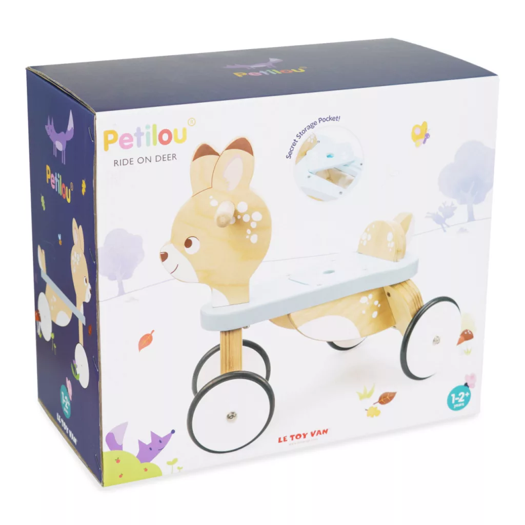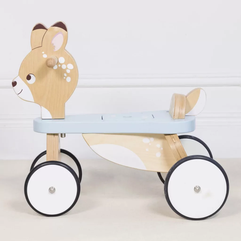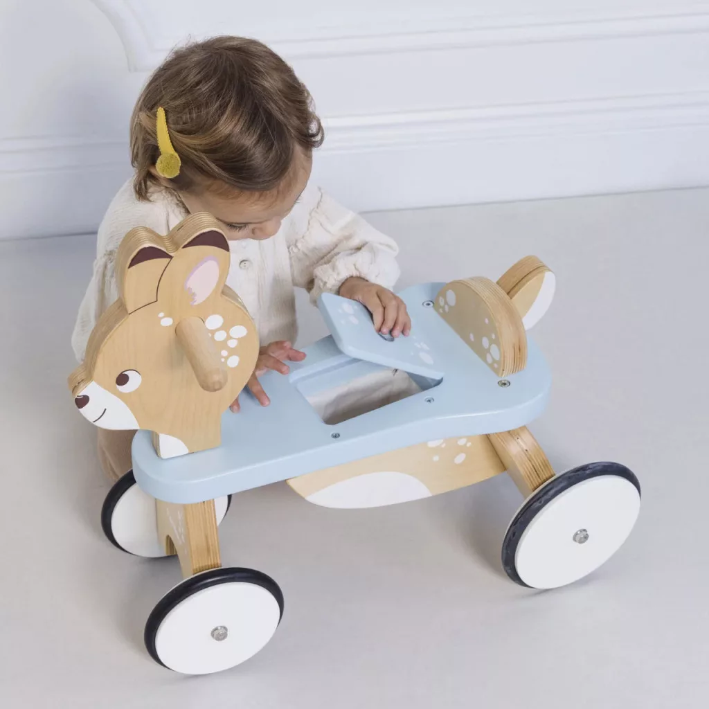 Le Toy Van - Szarvasos futóbicikli: Bűbájos „őzike” futóbicikli rejtett ülés alatti tárolóval - a kedvenc kincsek és uzsik helye. A stabil, gumifából készült váz és a lekerekített formák biztonságosak, a pasztellszínek pedig minden gyerekszobába illenek. A lábbal hajtás fejleszti az egyensúlyt, a koordinációt és az állóképességet; tökéletes előkészítés a pedálos bicajhoz. Tartós, könnyen szerethető első jármű, amely hosszú séták és udvari körök hű társa lesz.
