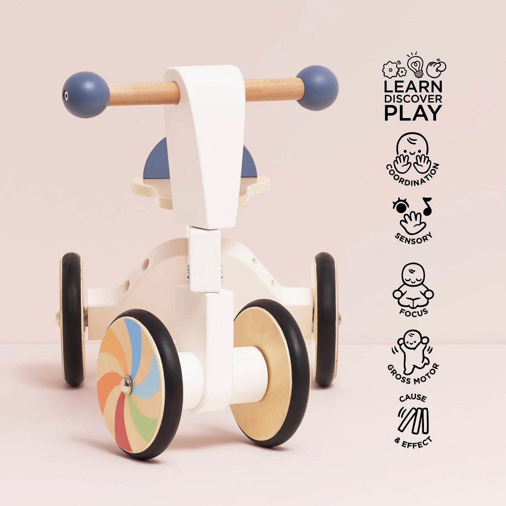 Fedezd fel a járás után a gurulás örömét ezzel a gyönyörű, szivárvány színekben tündöklő fa futóbiciklivel! A Le Toy Van futóbicikli FSC minősített fából készül, masszív, stabil, és segíti a kicsik egyensúlyérzékének, lábizmainak és mozgáskoordinációjának fejlődését. Gumírozott kerekei csendesek és minden felületen jól tapadnak, a kézzel festett részletek pedig különleges, időtálló megjelenést adnak. Tökéletes választás első „bringának”, amely magabiztosságot ad és örömteli szabadtéri játékra hív.