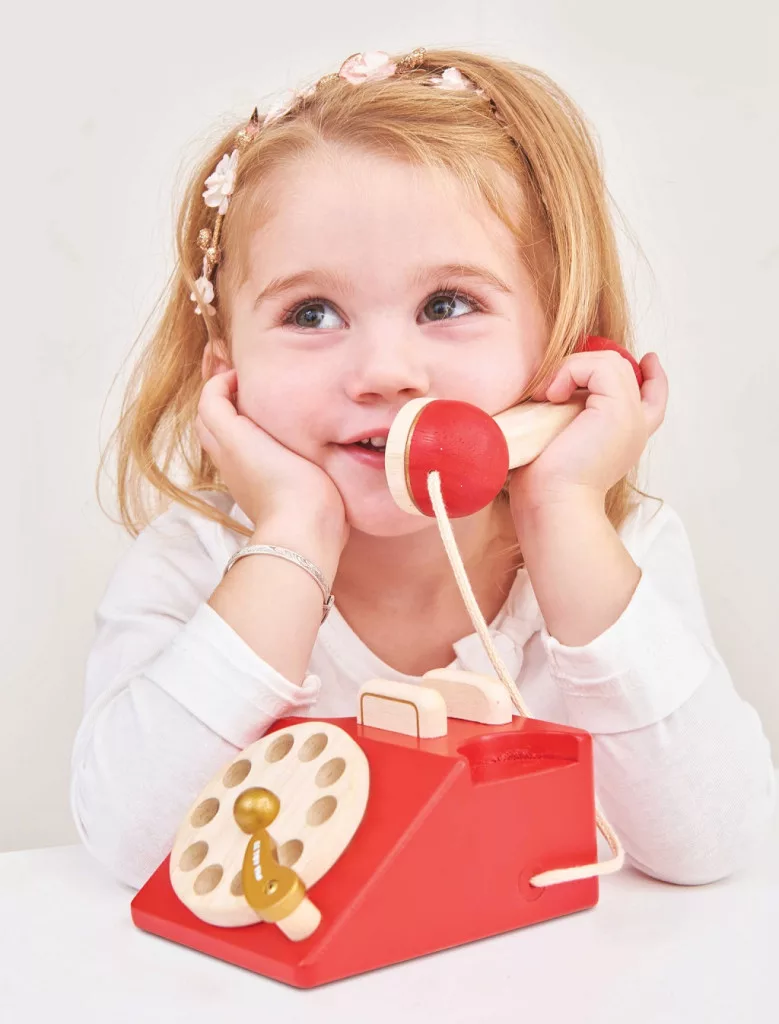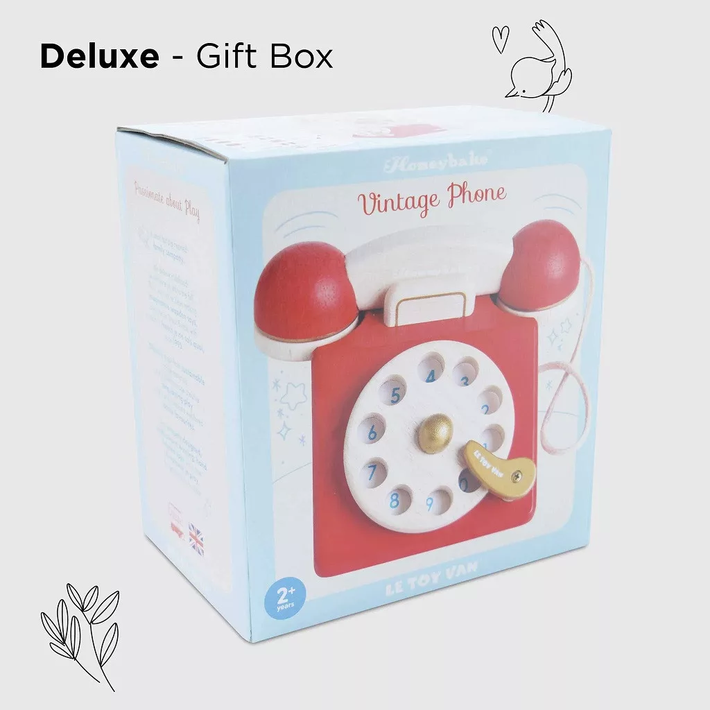 Le Toy Van - Vintage fa telefon: Csengő a kagylóban, forgatható tárcsa, mélypiros szín arany részletekkel - pont, mint régen. A gyerekek „felhívhatják” a plüssöket, és közben gyakorolják a számfelismerést, a szerepcserét, a beszélgetést. Fenntartható kaucsukfa, vízbázisú festék, klasszikus forma; a Honeybake világgal tökéletesen illeszkedik. Tartós, naponta újra kézbe vehető játék, amely fejleszti a motorikát és a kommunikációt, és igazi nosztalgiát visz a gyerekszobába.