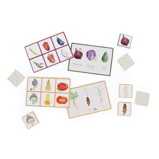 A Moulin Roty kártyajátéka 36, zöldségeket bemutató kártyából áll.
