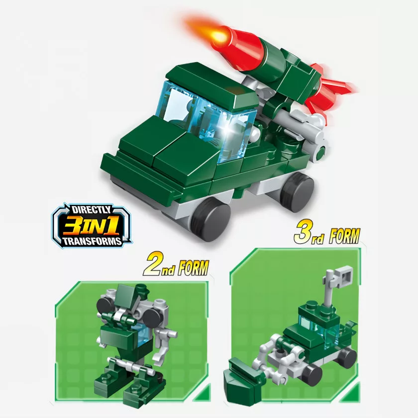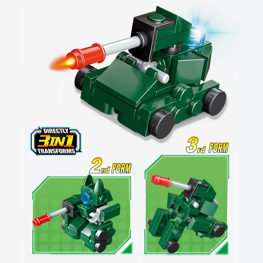 Ez a 10 darabos készlet remek választás, ha gyermeked szereti a változatos járműves mini modelleket. A csomagban repülő, tank, rakétás jármű, ágyú, tengeralattjáró, formula autó és más különleges modellek is helyet kaptak, mindegyik háromféle összeállítási lehetőséggel.