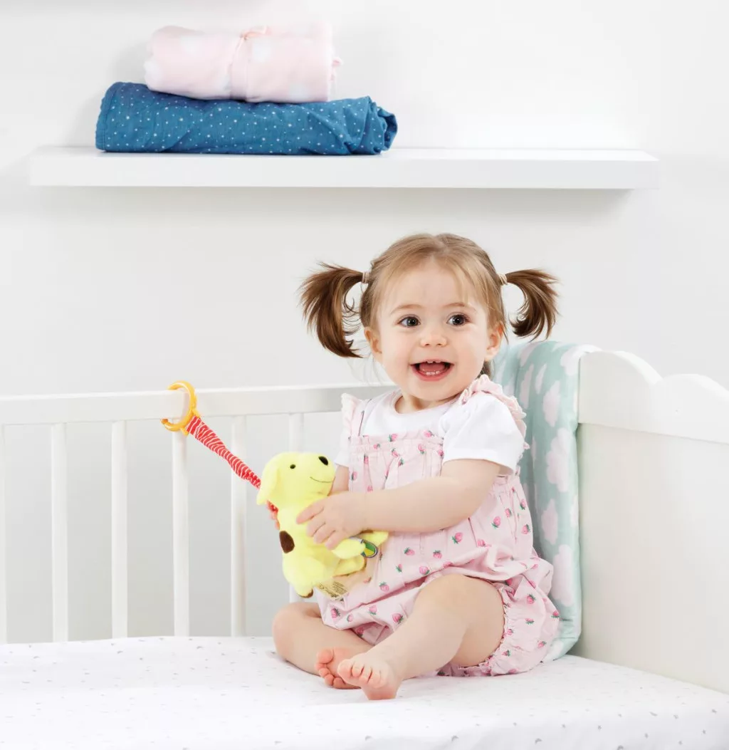 Ez a 13 cm-es színes kutyus játék visszarezeg, ha meghúzzák. Fejleszti a gyerekek érzékszerveit és motorikáját. Könnyen rögzíthető kiságyra vagy autósülésre.