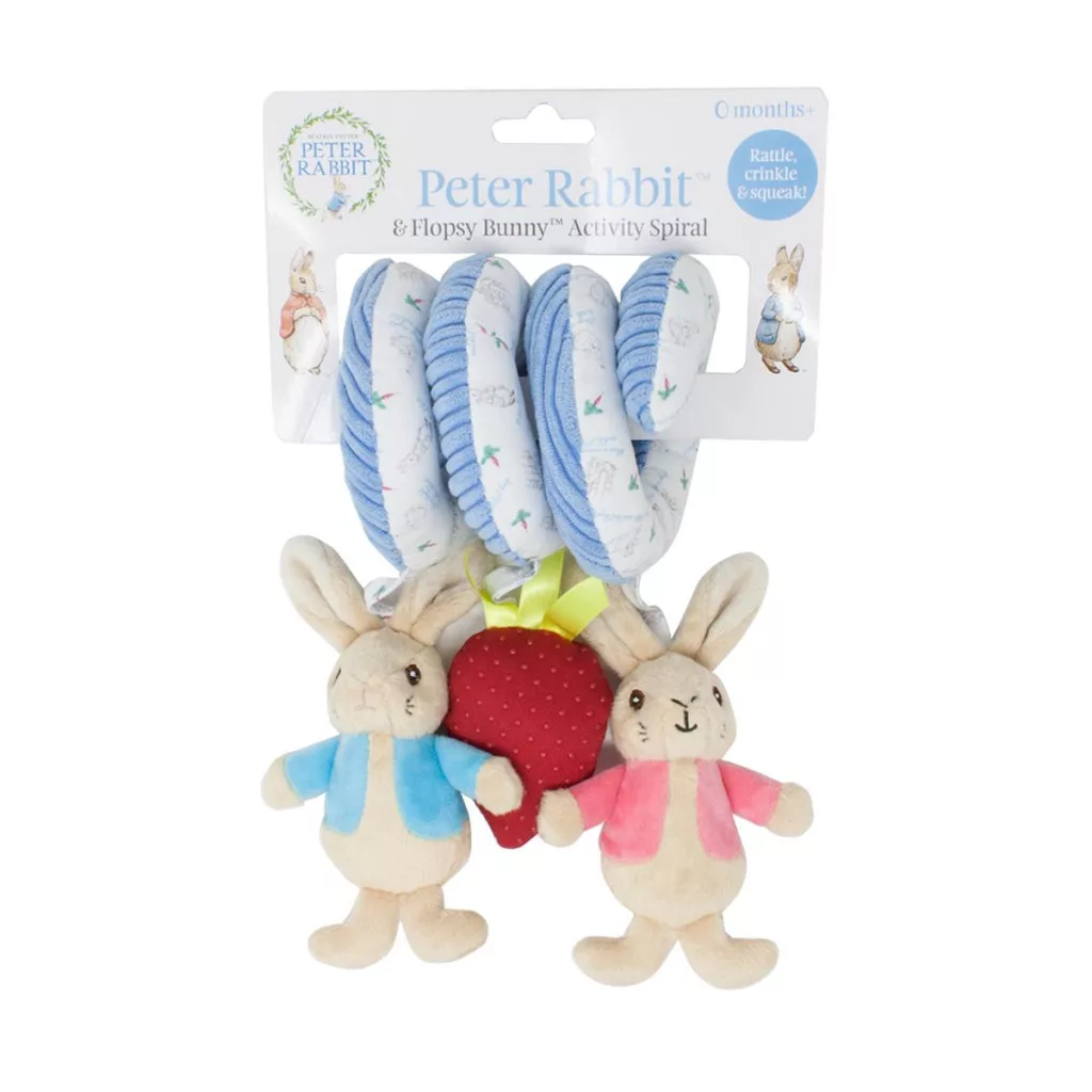 Puha spirálos csörgő, amelyen Péter nyuszi és Flopsy nyuszi figurák lógnak. A játék csörgő hangot ad, így fejleszti a gyermek érzékszerveit.