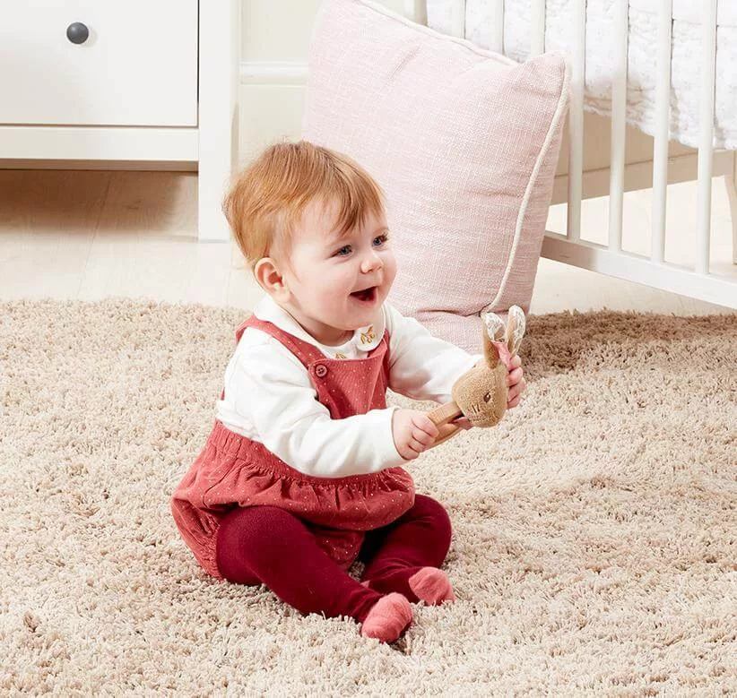 Ez a klasszikus stílusú Flopsy nyuszi csörgő a Beatrix Potter mesék hangulatát idézi. A puha plüssfigura egy antibakteriális tulajdonságú fa gyűrűn ül, amely fogzáskor is megnyugtató. A finom csörgőhang segíti a szenzoros fejlődést, miközben a természetes anyagok biztonságosak a babák számára. Kiváló ajándék újszülötteknek.