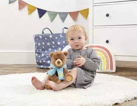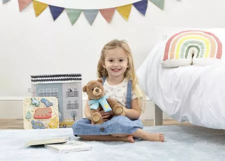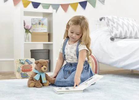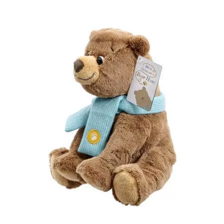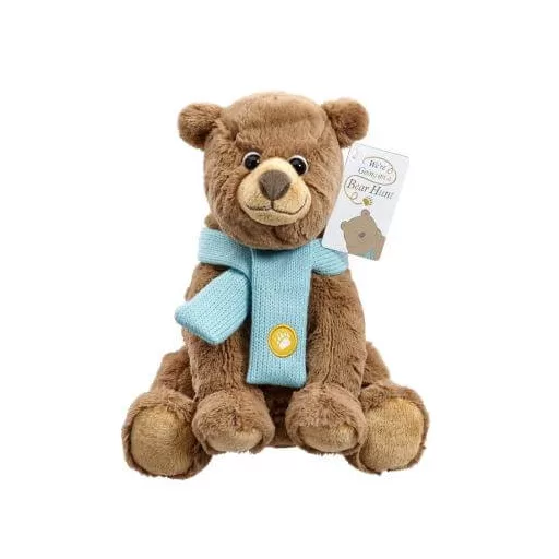 Ez a 20 cm-es medvefigura a „Megyünk medvét vadászni” című könyv hangulatát idézi. Puha bundája, nagy szemei és saját kis sálja teszik különlegessé. A gyerekek saját történeteket találhatnak ki vele, vagy együtt olvashatják a mesét. Tökéletes ölelgetni való társ, amely már újszülött kortól biztonságosan használható.