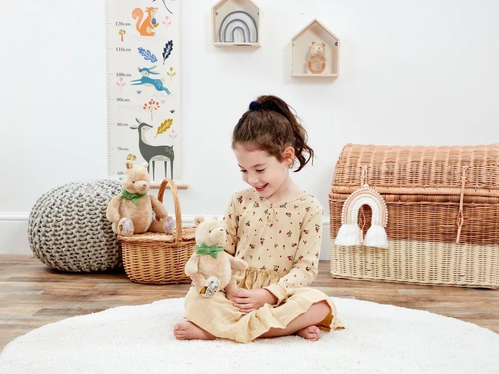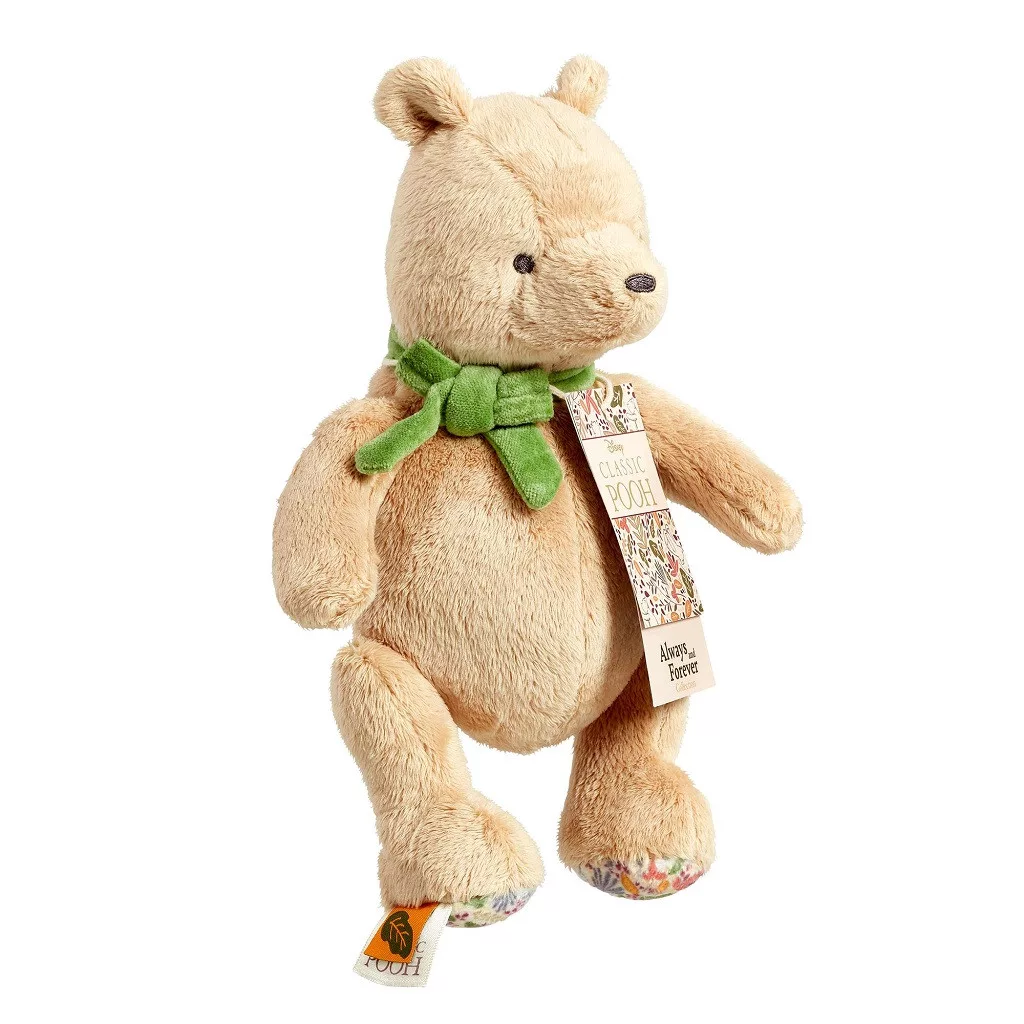 Klasszikus Micimackó figura zöld masnival és erdei mintás tappancsokkal. Puha, újrahasznosított anyagokból készült, tökéletes első plüss újszülötteknek.