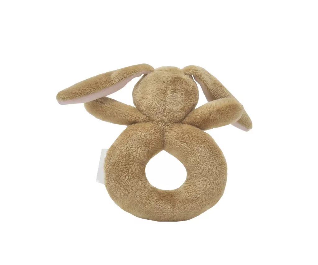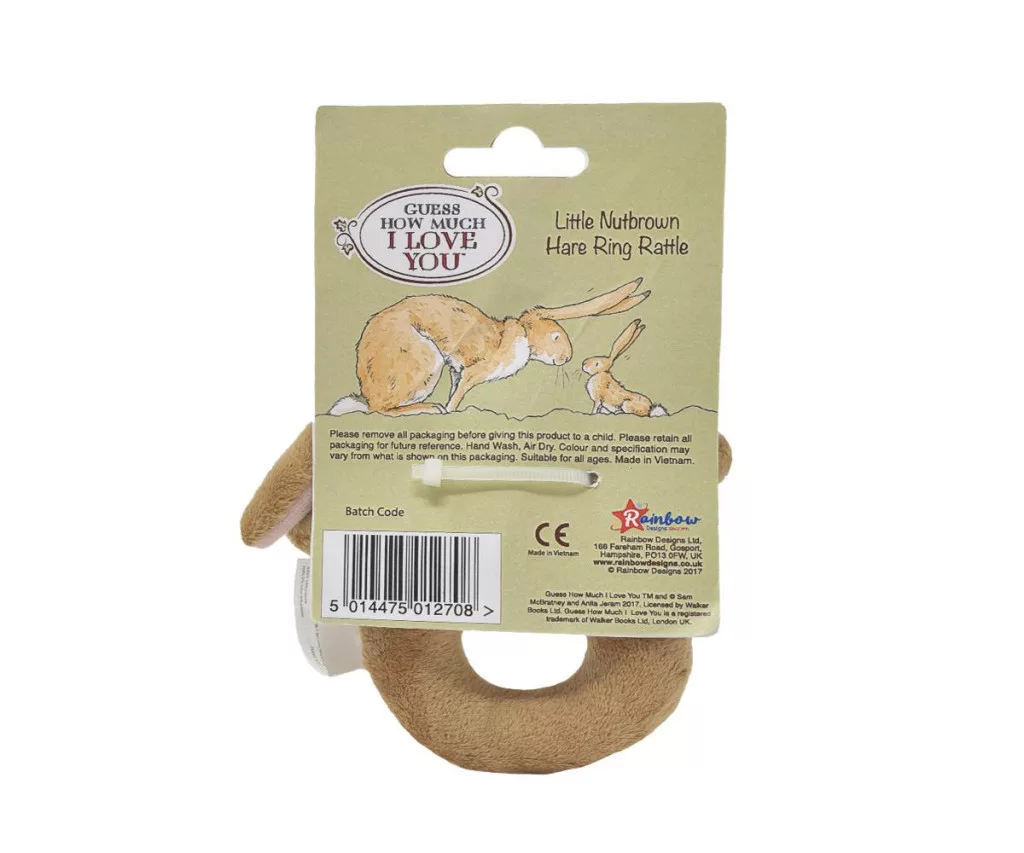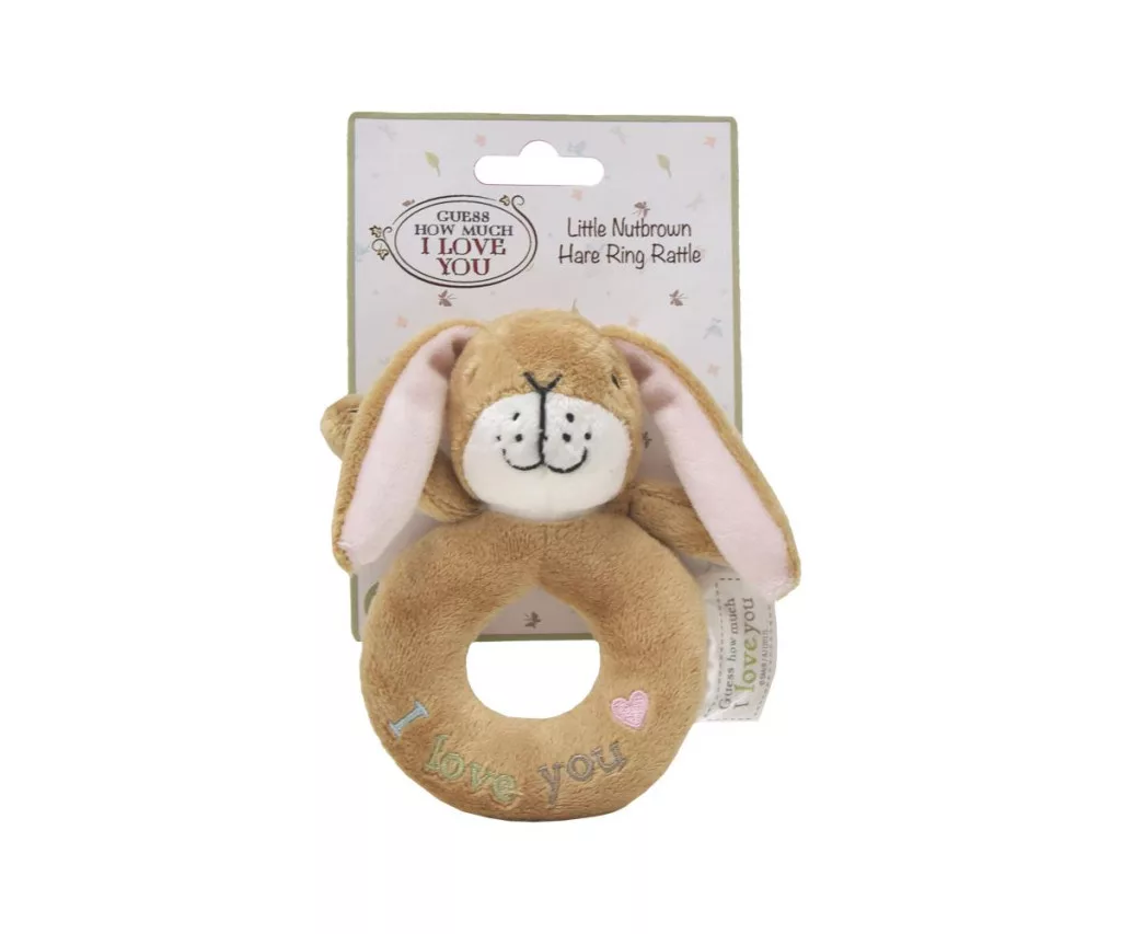 A népszerű könyv ihlette nyuszis csörgő puha plüssből készült, hímzett arccal és "I love you" feliratú gyűrűvel. Fejleszti a gyermek érzékszerveit, ideális ajándék.