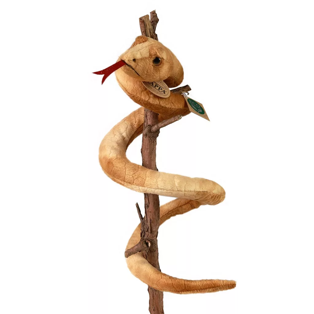 Ez a 90 cm-es barna kígyó különösen látványos és élethű. Kézzel készült, puha plüssből, újrahasznosított PET-palackokból készült töltettel.